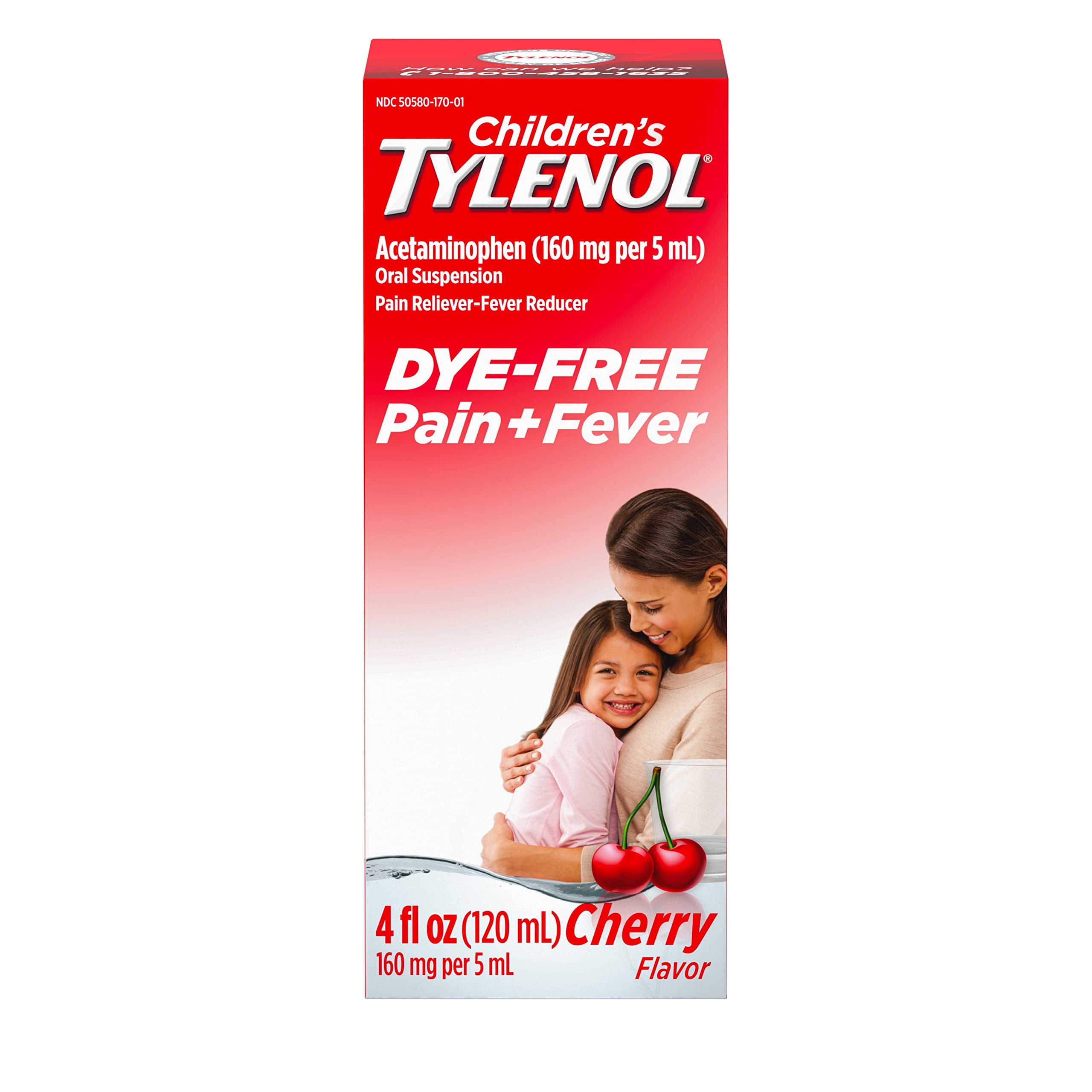 Intended for kids ages 2 to 11 years, Children's Tylenol Liquid Oral Suspension Medicine with Acetaminophen in a Dye-Free Cherry flavor provides temporary relief from a range of cold and flu symptoms, including fever, minor aches and pains, toothache, headache and sore throat. Each 5- milliliter dose of this kids' liquid medicine contains 160 milligrams of the pain reliever and fever reducer acetaminophen to temporarily reduce fever and help relieve minor aches and pains due to the common cold and flu. This children's cold and flu symptom medicine also comes in a kid-friendly dye-free cherry flavor and is high fructose corn syrup-free, ibuprofen-free, aspirin-free, paraben-free and alcohol-free, and is gentle on the tummy. From the #1 pediatrician recommended brand for pain and fever relief, Children's Tylenol has been used by parents decade after decade for effective symptom relief.