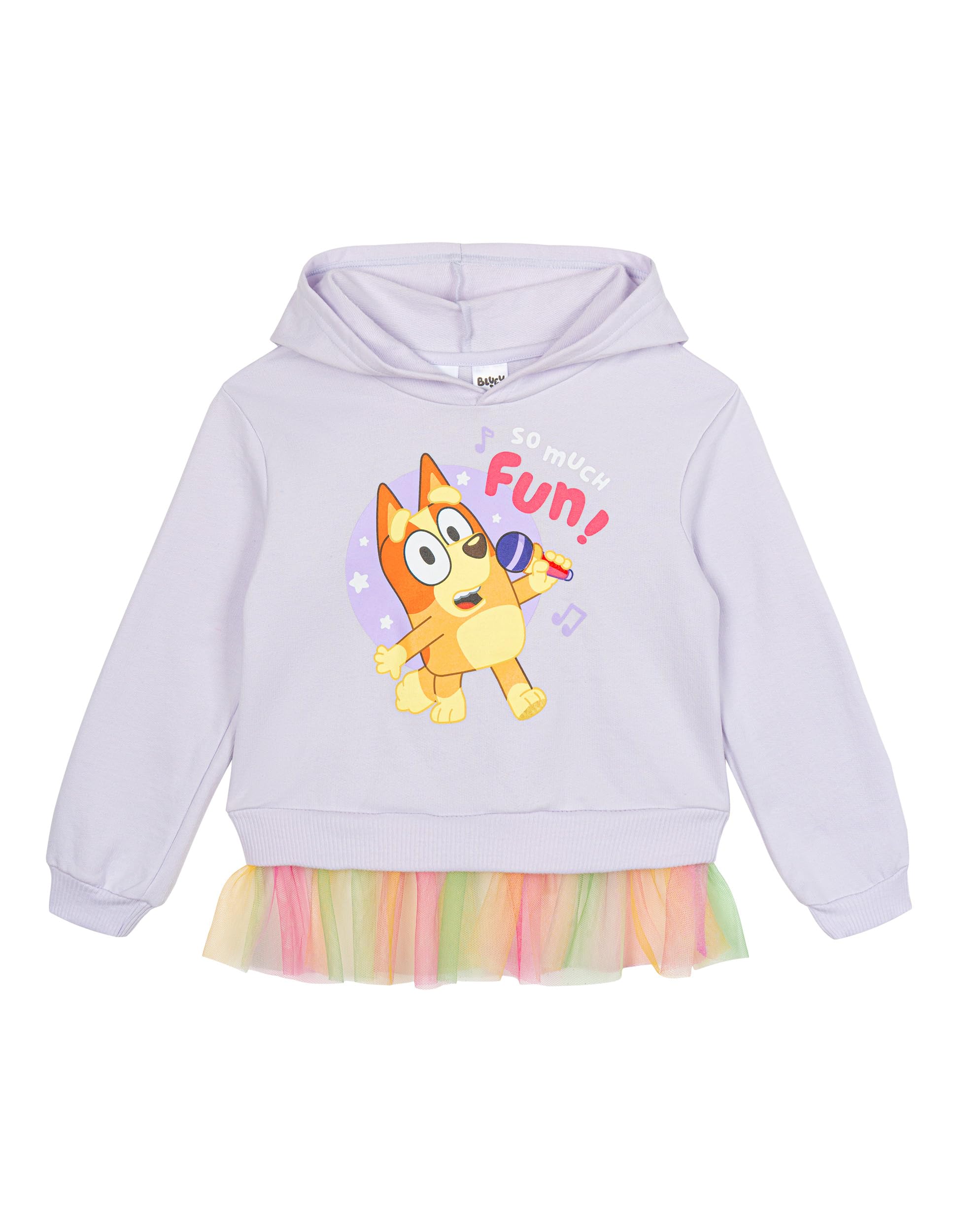 Description Your kid is ready to play in this stylish and comfy Bluey outfit! This adorable long sleeve hooded sweatshirt and pants set features cute ruffles and vibrant artwork of Bluey and her sister Bingo that your Bluey fan will love to wear. Made of a soft material that keeps your child comfortable, this fashionable Bluey clothing set is perfect for all-day fun and adventure!