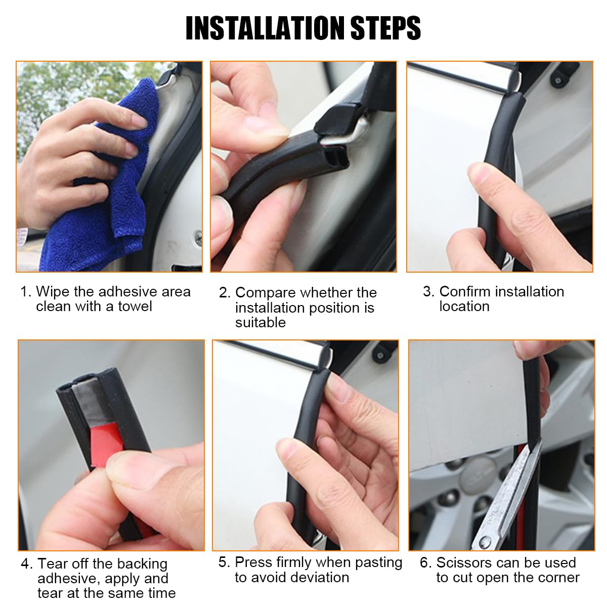 How to Use: This door seal is simple and easy to install. First of all, you should wipe the paste location with a towel. Next, you need to compare the door seal with the mounting location and cut the length you need with scissors. Then, you should peel off the adhesive backing of the seal as you go. Finally, you just need to press the seal tightly while attaching it to complete the installation.