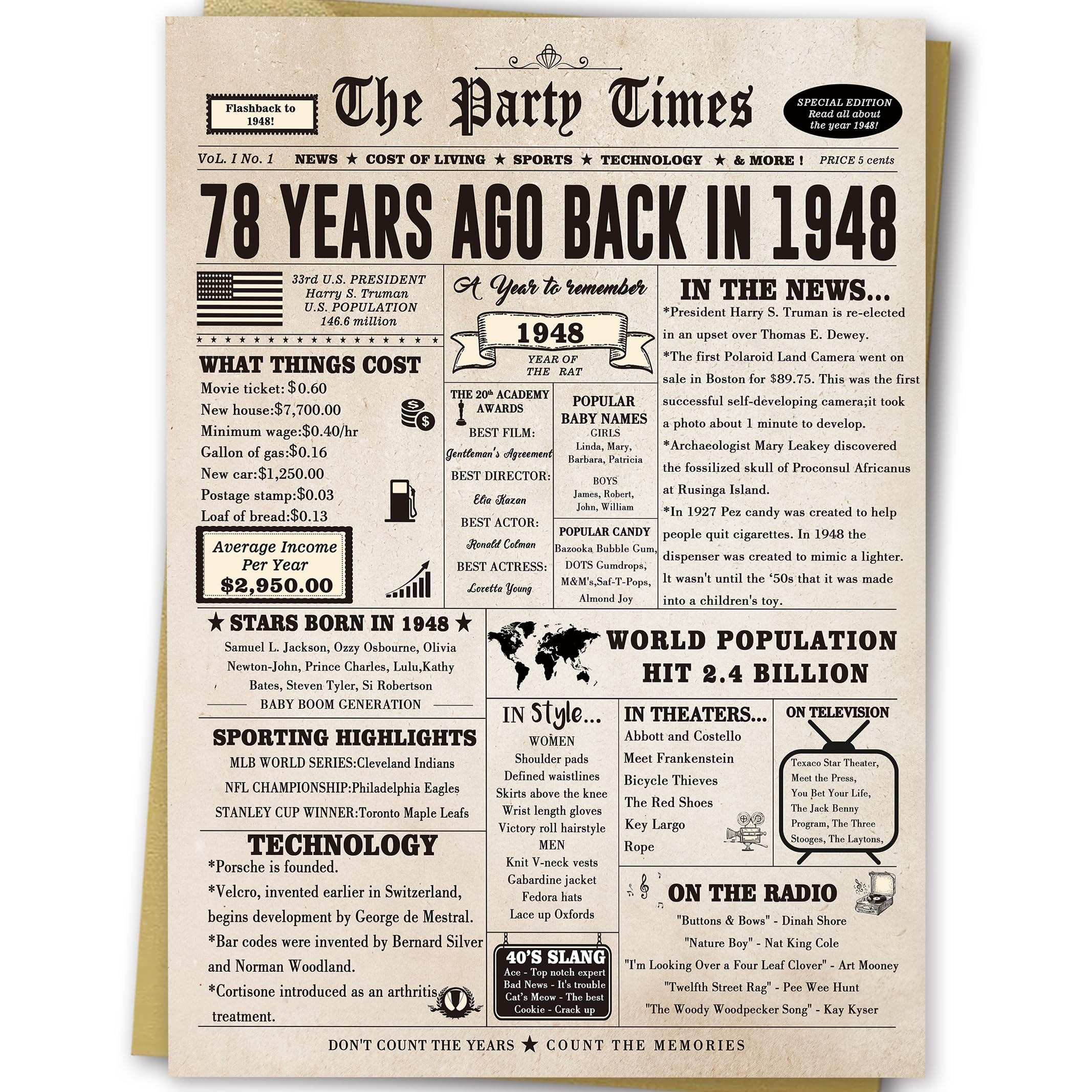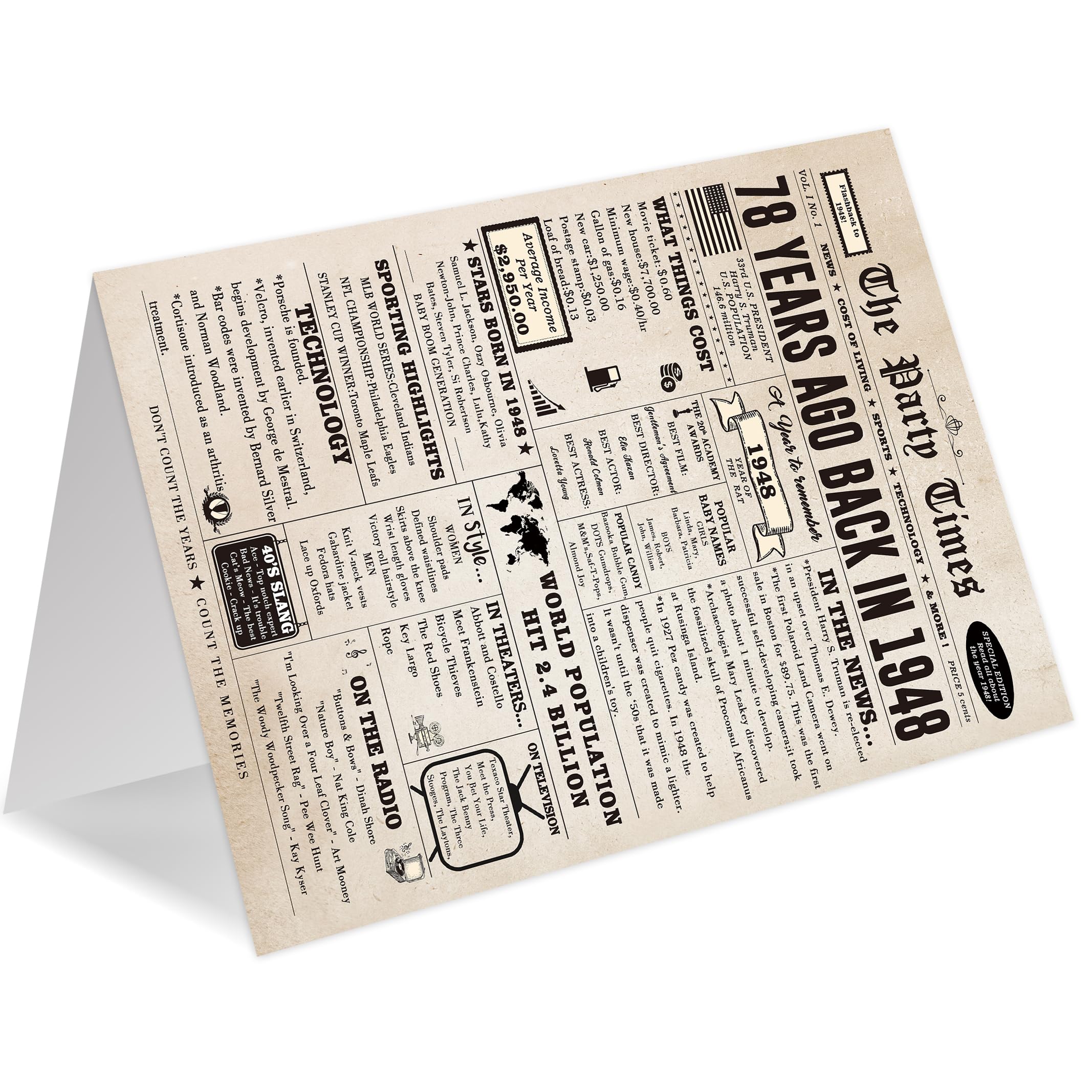 This large 78th birthday card features a vintage newspaper design, showcasing important events, movies and sports events from 78 years ago