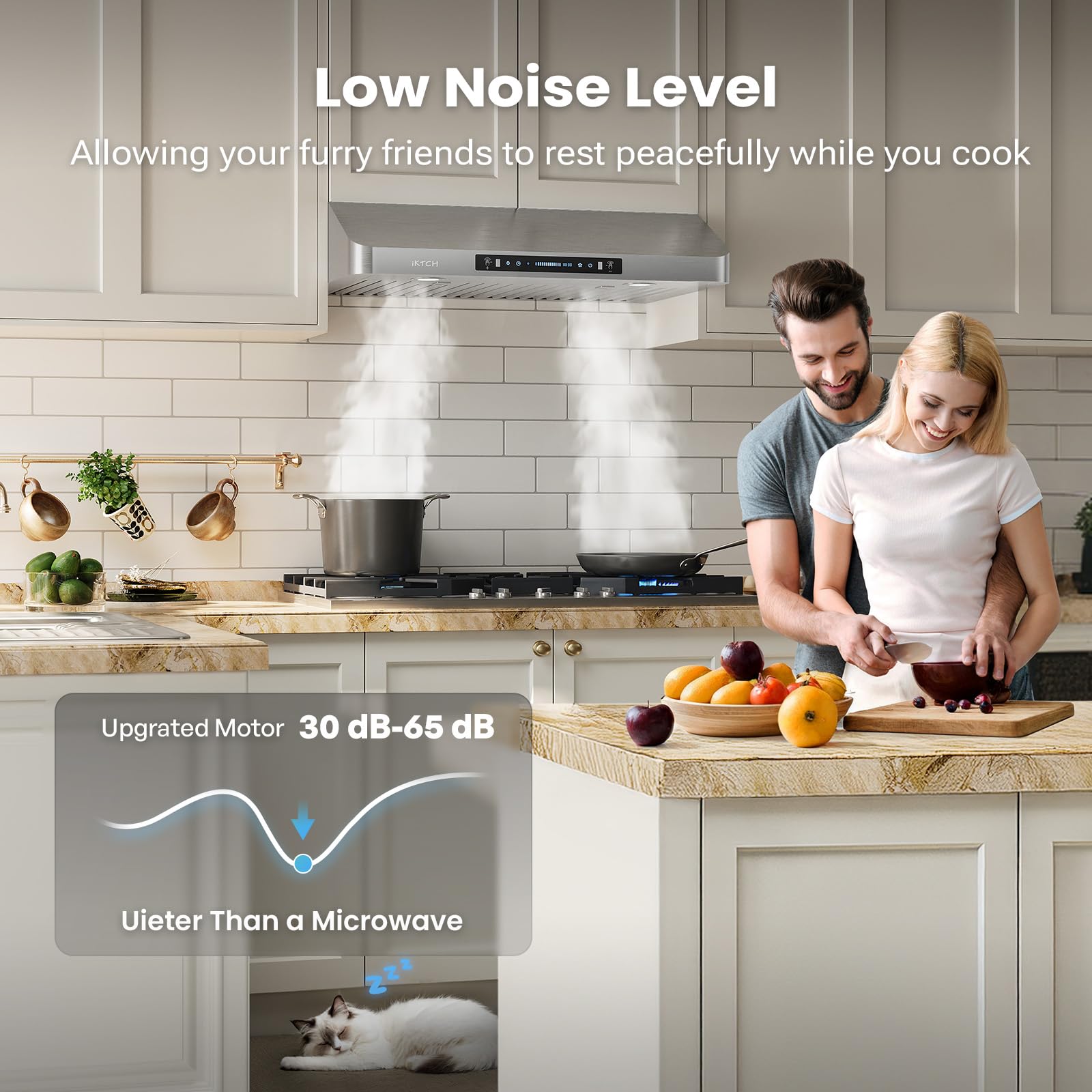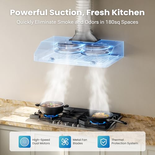 Ultra-Quiet Operation: Enjoy a peaceful cooking environment with noise levels kept below 65DB even at high speed. Equipped with a high-performance 4-speed motor, it ventilates your kitchen efficiently yet quietly, eliminating cooking fumes and odors without disrupting your daily life or conversations