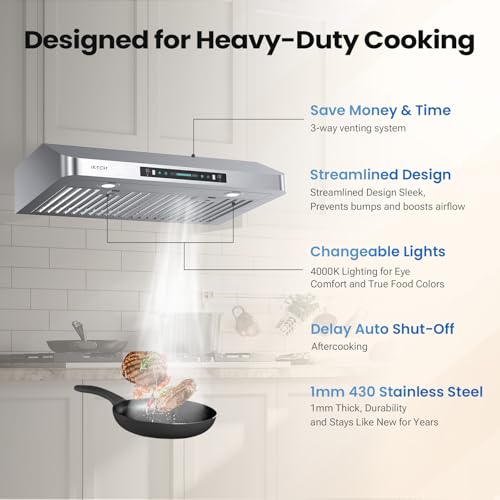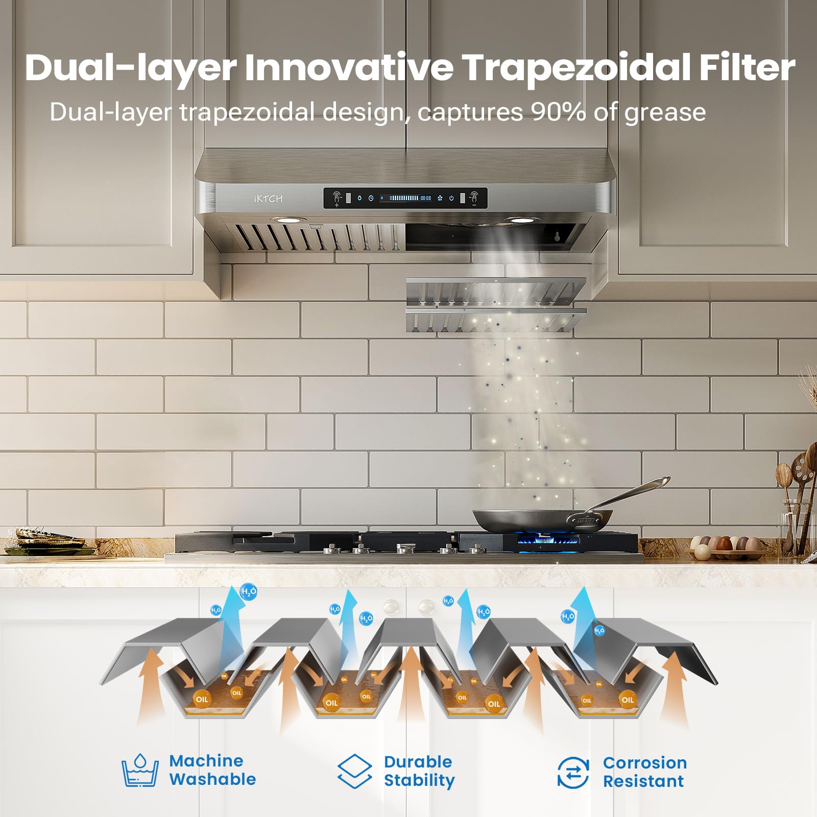 Easy-To-Clean Filters: Designed with premium stainless steel baffle filters, the IKTCH 30in range hood is more durable and low-maintenance, offering long-term cost savings. Cleaning is a breeze—simply place the filters in the dishwasher for a thorough, hassle-free clean, no tedious hand-washing required
