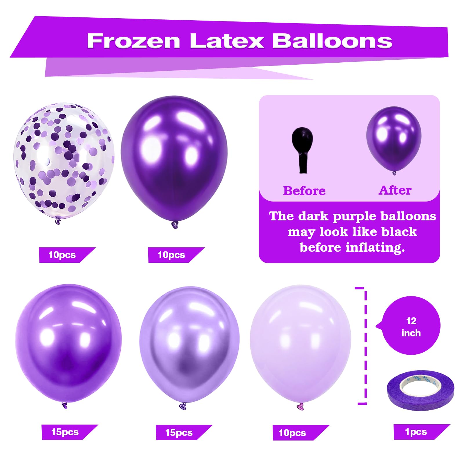 【What You Will Get】Purple balloons set includes 10pcs metallic purple balloons, 15pcs dark purple balloons, 10pcs pastel purple balloons, 15pcs pearl light purple balloons, 10pcs dark purple confetti balloons and 1pc purple ribbon. The size of the balloon is about 12 inches after inflation