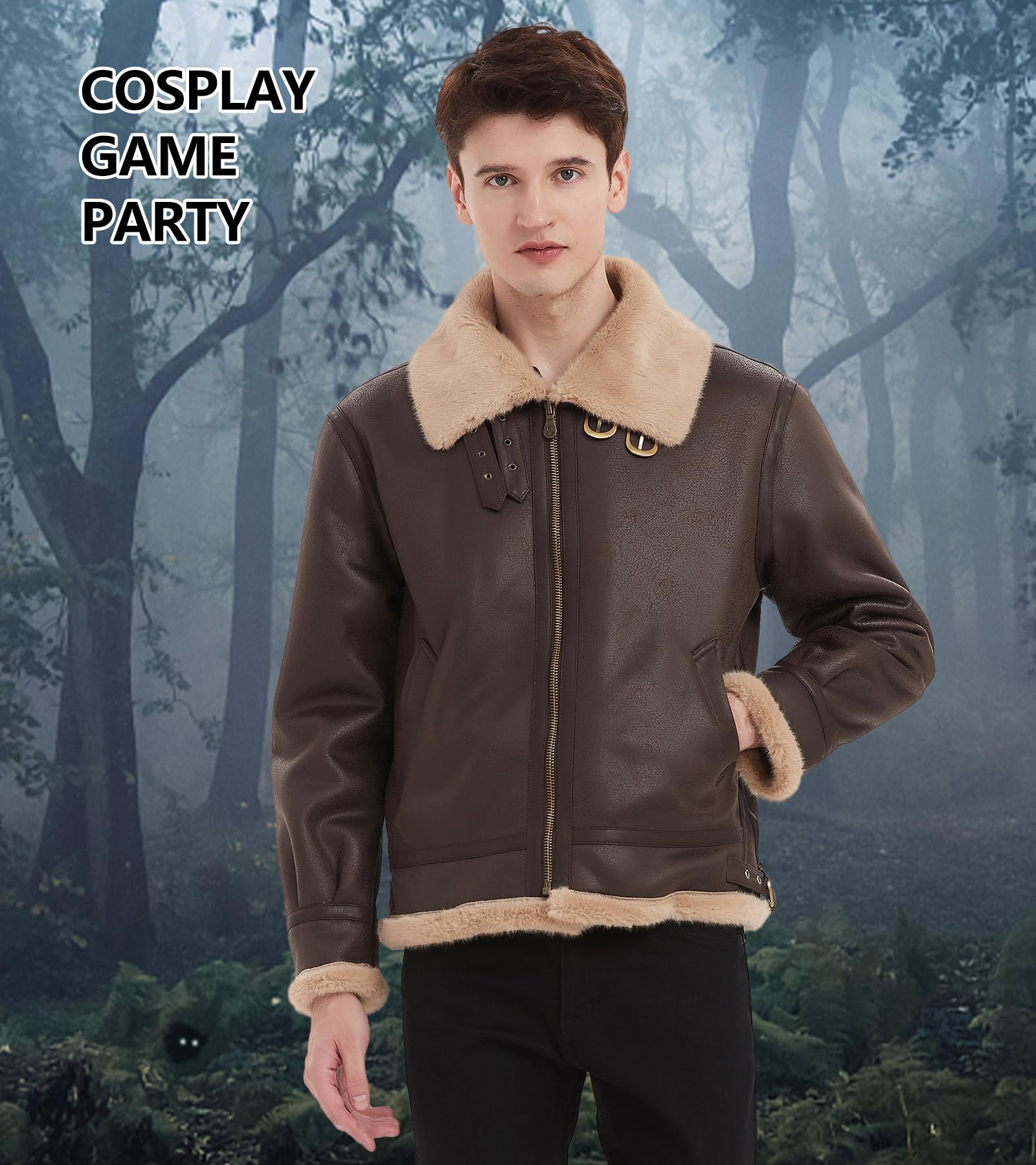 Design: All the decorative lines of the hem, collar, edge and cuff are in-stitched with super-thick lines to restore the game graphics. The decorative waist buckle, imitation shoulder strap, plush cuff are all same as Leon Kennedy in the game.