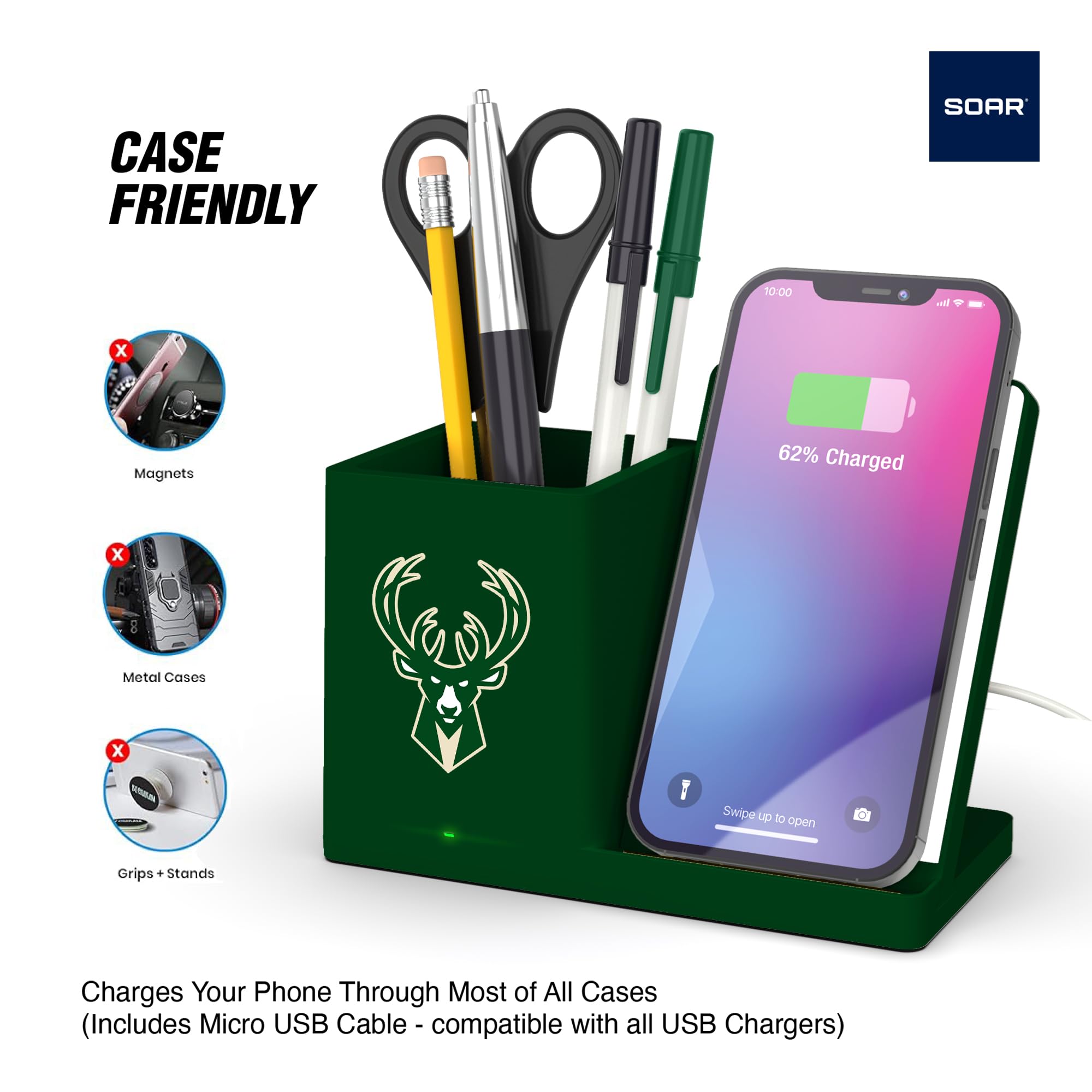 The SOAR wireless charging desktop organizer is the perfect desk accessory for the ultimate sports fan! Perfect for home or office use. The 10W of wireless charging power allows for quick desktop charging and is powerful enough to charge through your case. Helps keep your desk neat while making sure everyone knows who you’re routing for at the big game. Officially licensed NBA product with a 1 year manufacturer warranty.