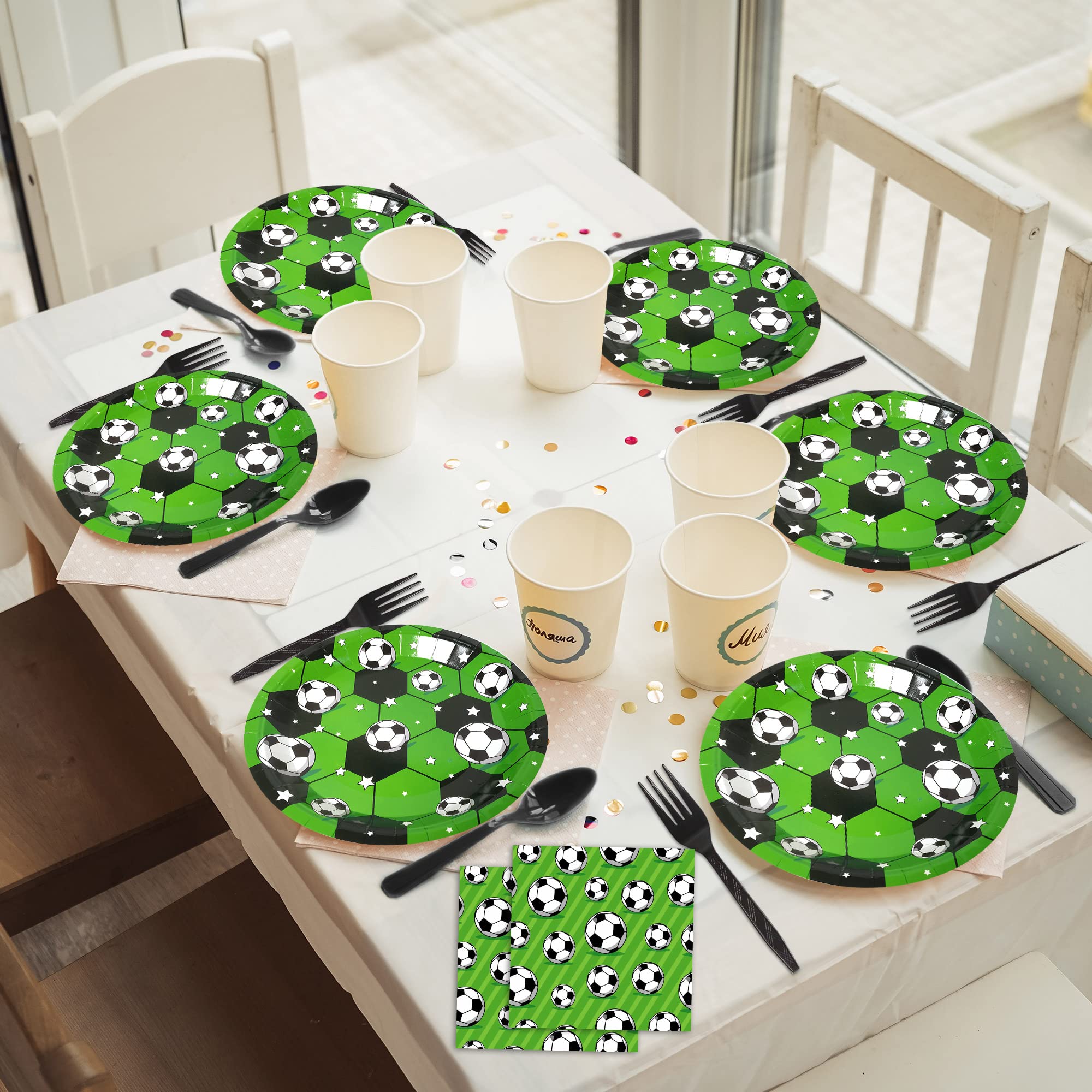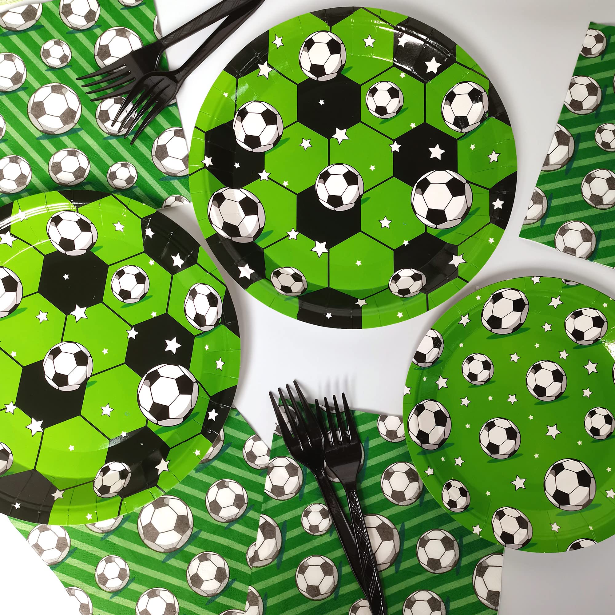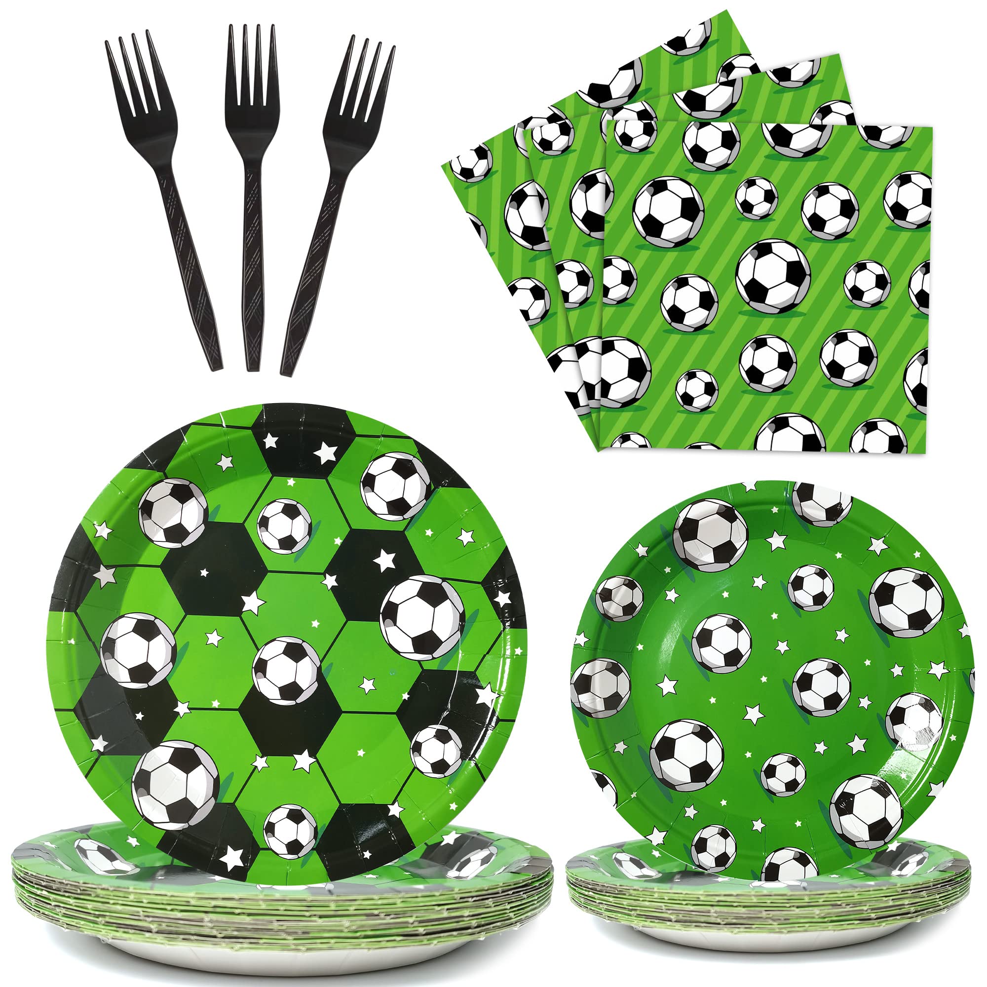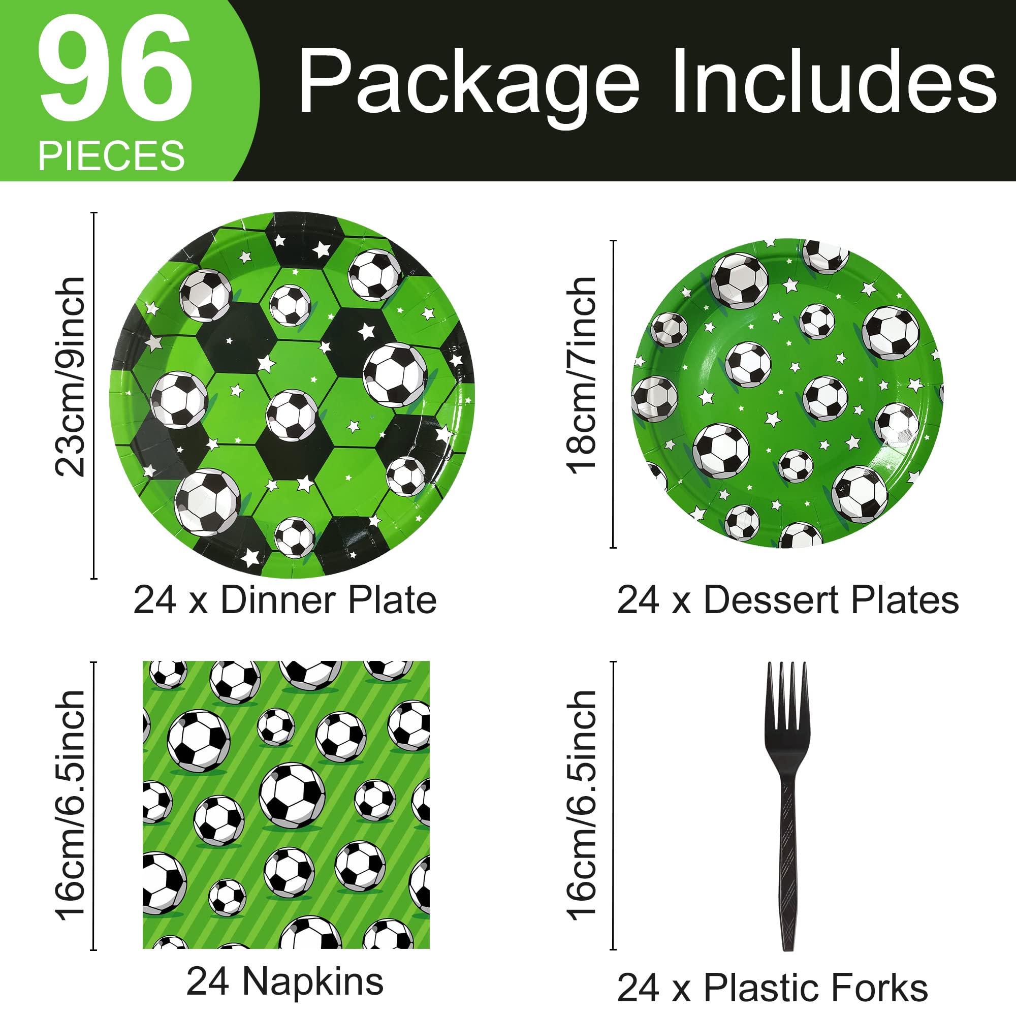 The package includes: You will receive 24 9" soccer party plates, 24 7" soccer birthday party plates, 24 6.5" soccer napkins, and 24 black plastic forks, each set can accommodate 24 guests.