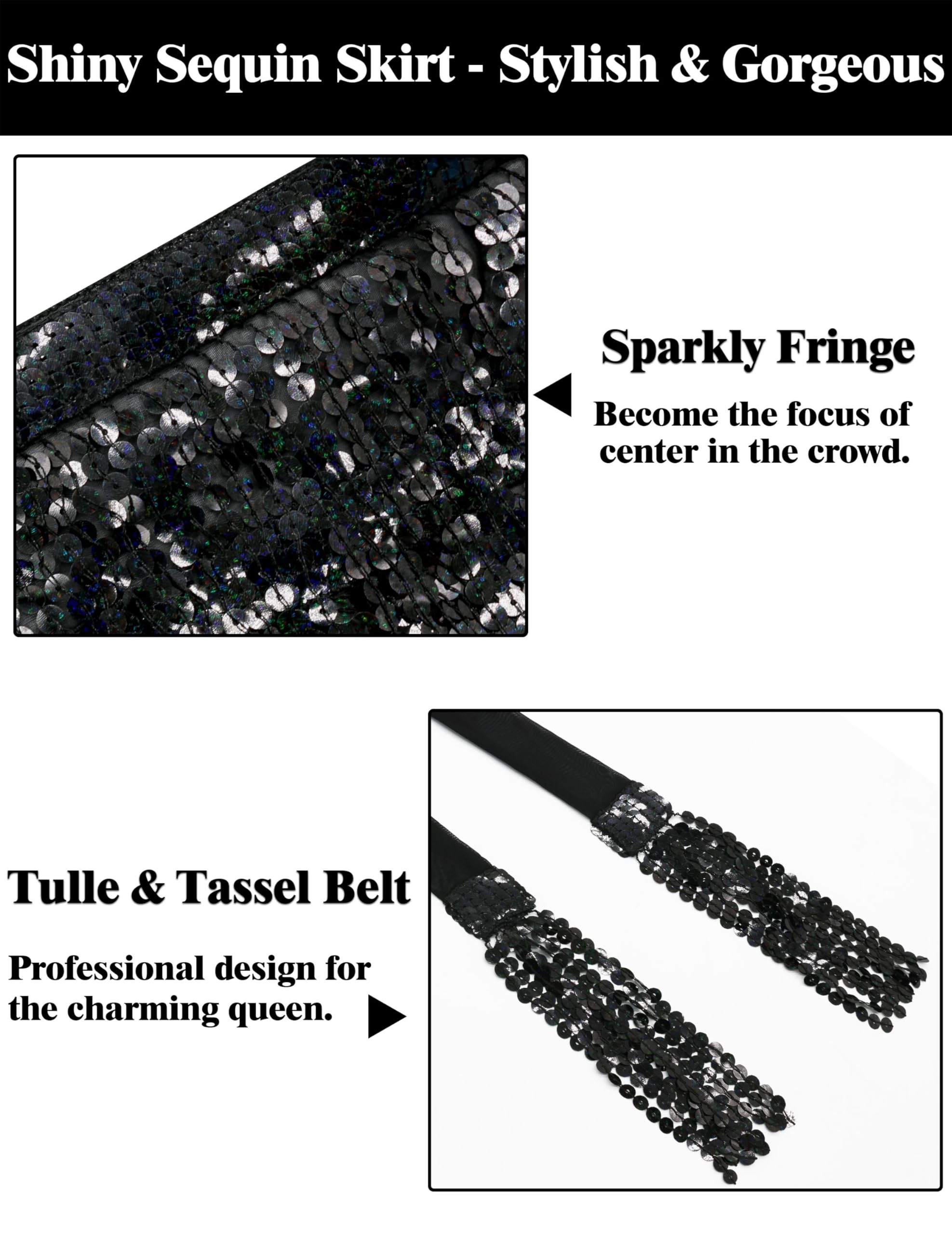 HIGH-QUALITY MATERIAL: Our sparkly skirt is made of excellent 100% Polyester with beautiful fringes and sequins, which is lightweight, skin-friendly and durable. Besides, the tulle lining under the sequins is comfortable and breathable, so you will feel great when you wear this sequin skirt. And we suggest to wear the shorts or leggings under the sparkly skirt to ensure full coverage and comfort!