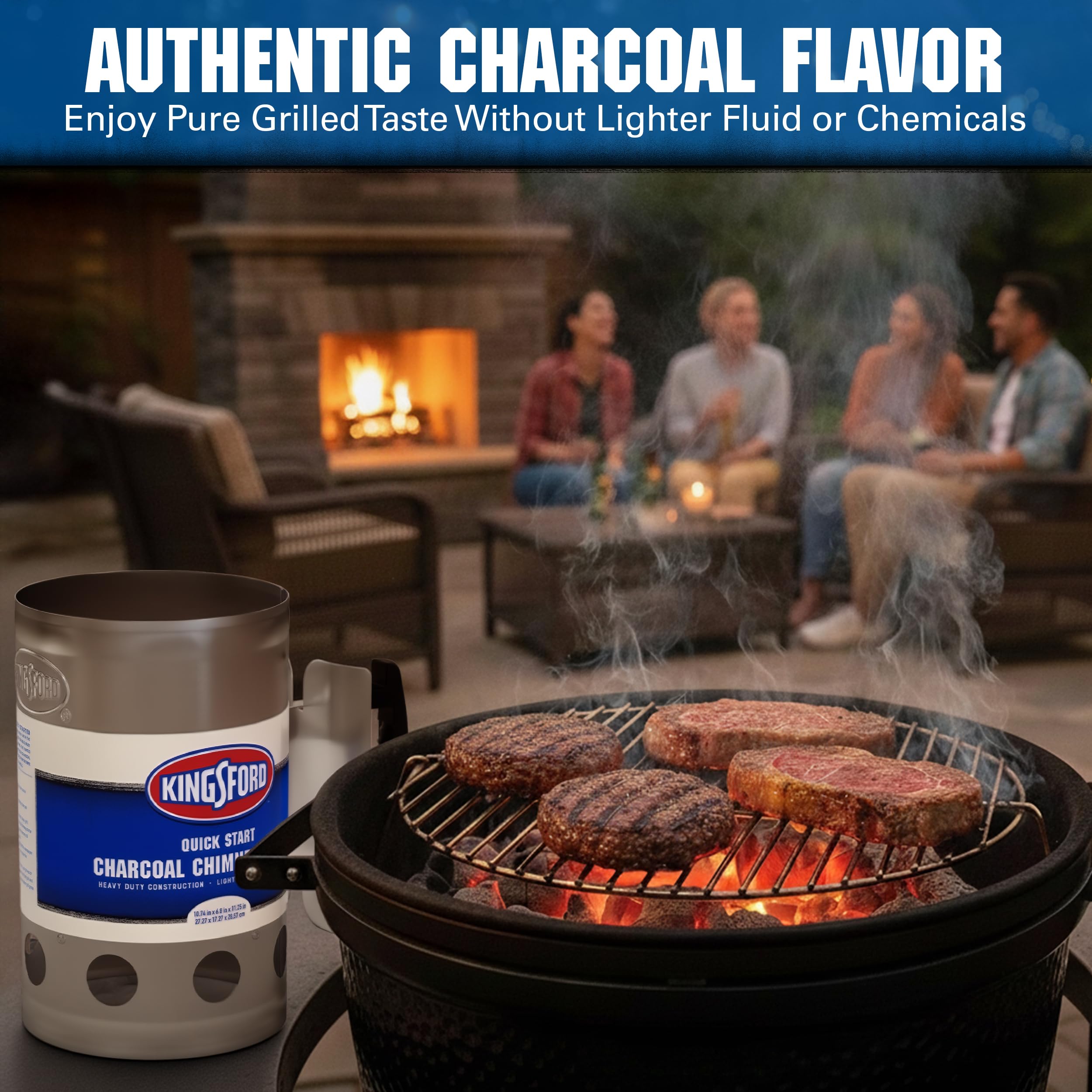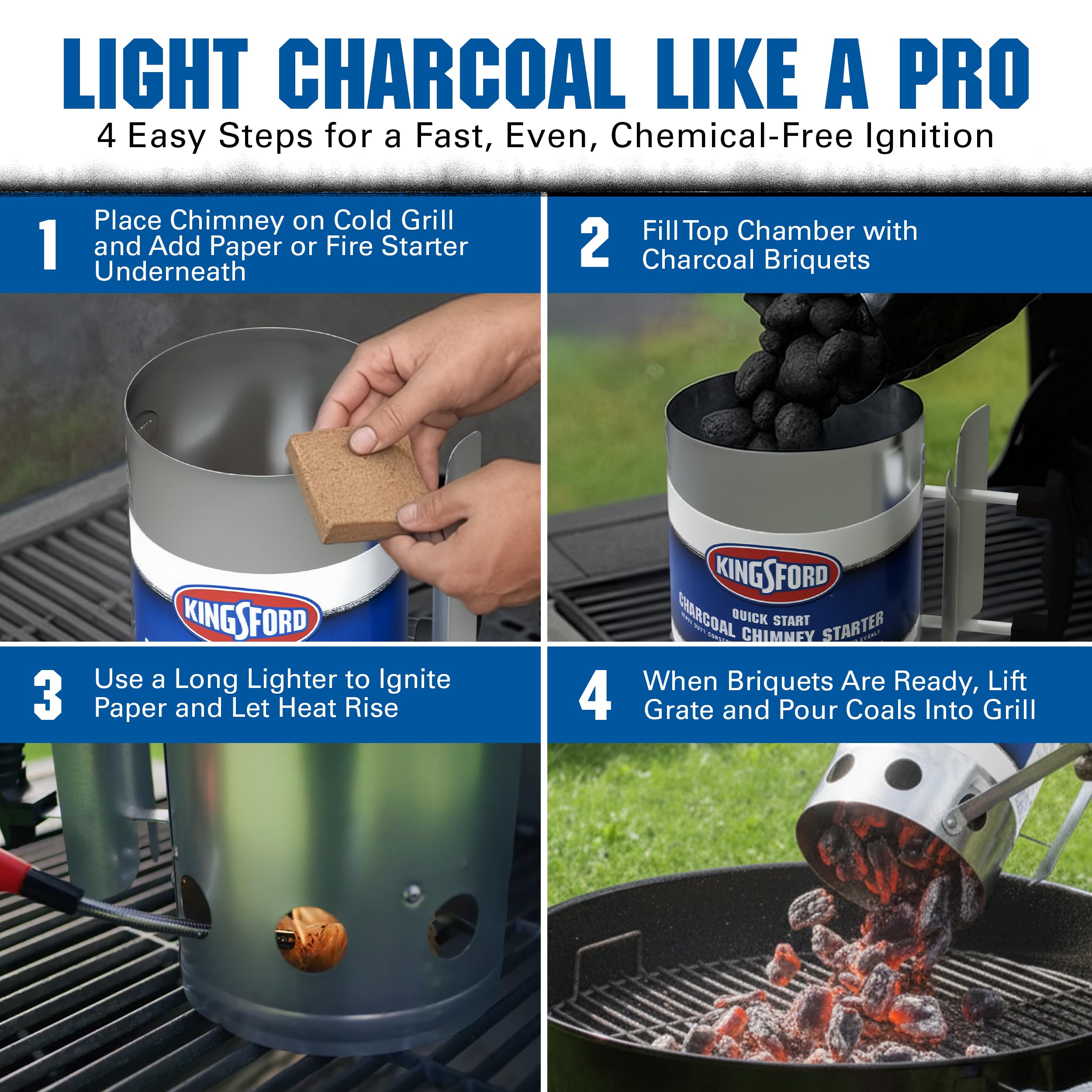 Charcoal chimney starter works fast — this easy to use charcoal chimney starter works fast. With the Kingsford chimney starter, your coals light up quickly and evenly