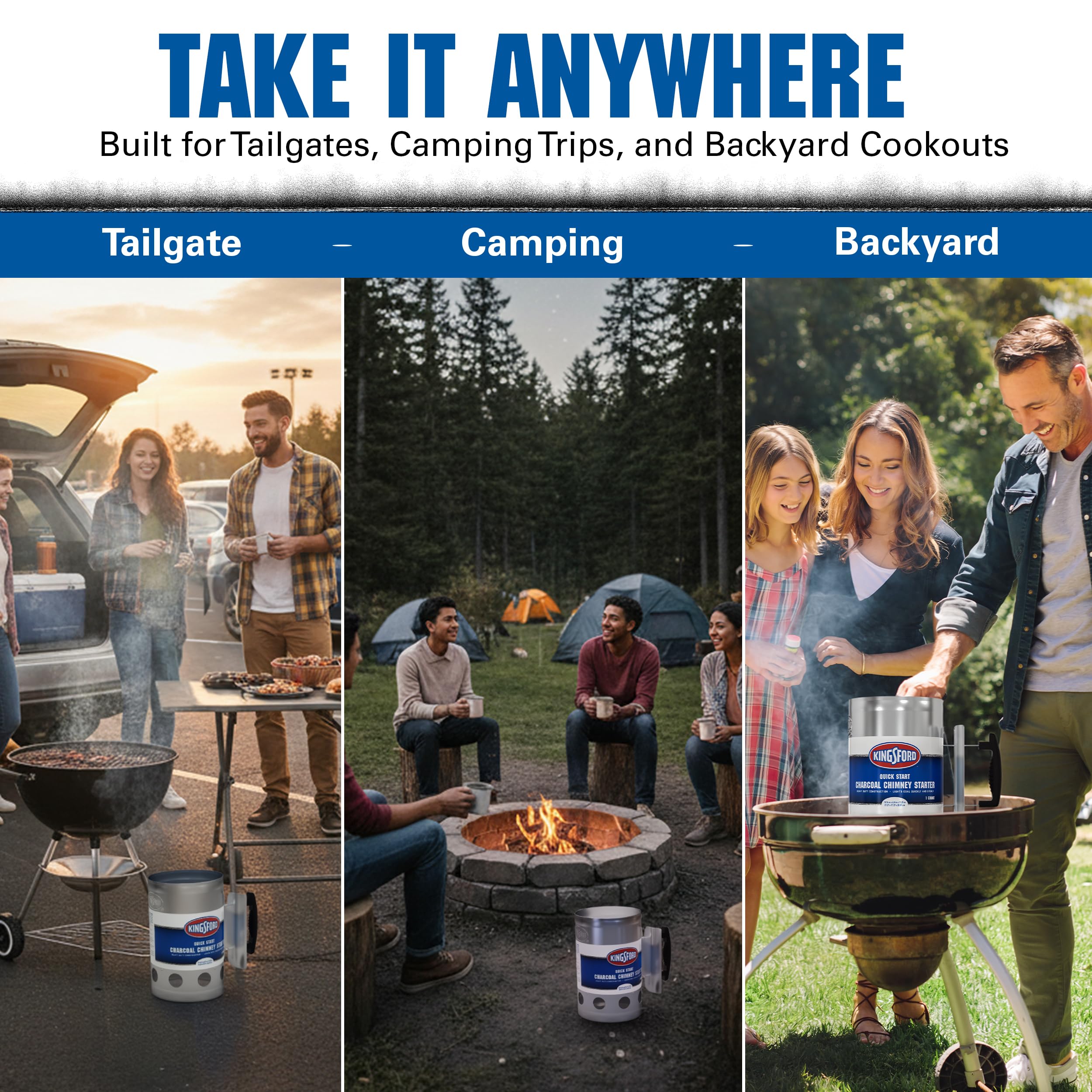 No assembly required — your Kingsford chimney starter arrives assembled and ready to use at your next barbecue, tailgate, or camping trip