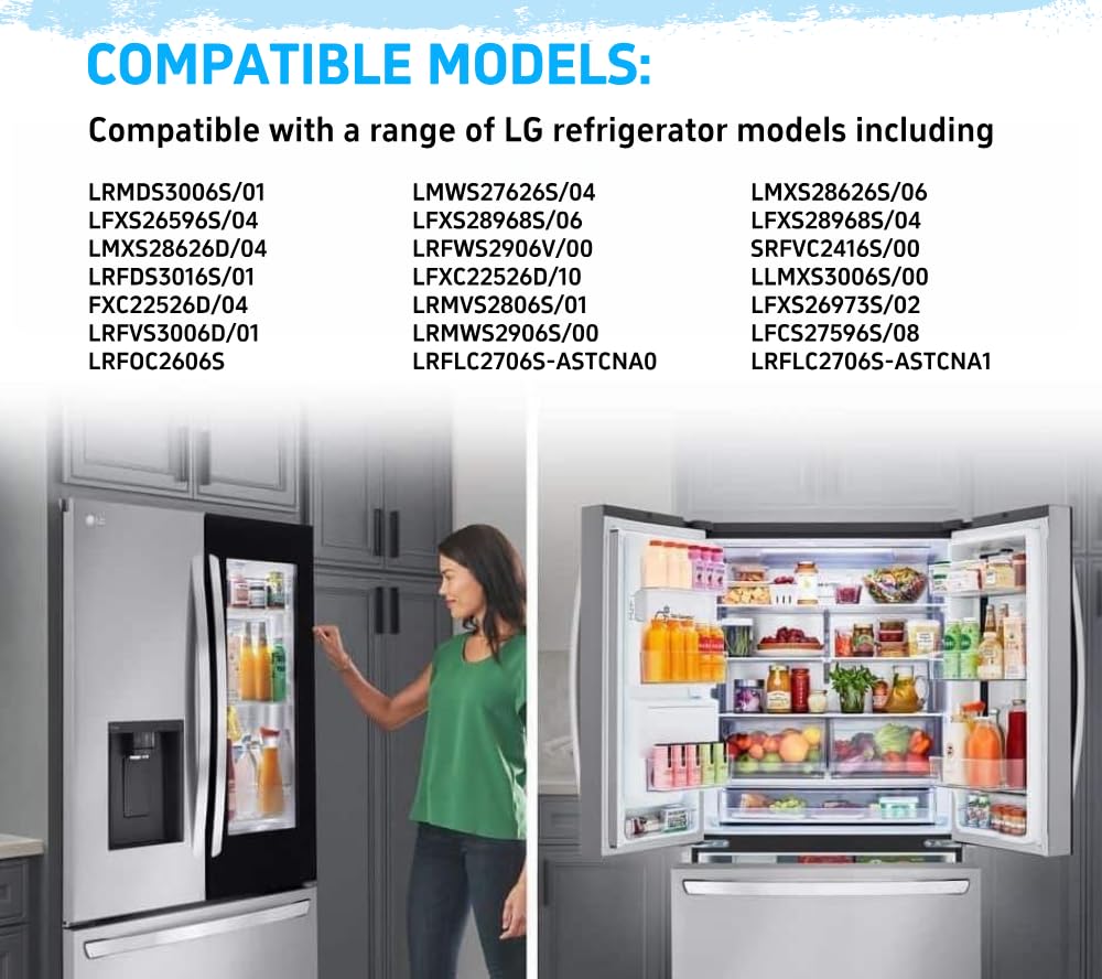Wide Compatibility: Compatible with a range of LG refrigerator models including LRMDS3006S/01 LMWS27626S/04 LMXS28626S/06 LFXS26596S/04 LFXS28968S/06 LFXS28968S/04 LMXS28626D/04 LRFWS2906V/00 SRFVC2416S/00 LRFDS3016S/01 LFXC22526D/10 LLMXS3006S/00 LFXC22526D/04 LRMVS2806S/01 LFXS26973S/02 LRFVS3006D/01 LRMWS2906S/00 LFCS27596S/08 LRFOC2606S LRFLC2706S-ASTCNA0 LRFLC2706S-ASTCNA1 and more (please confirm part number before purchase).