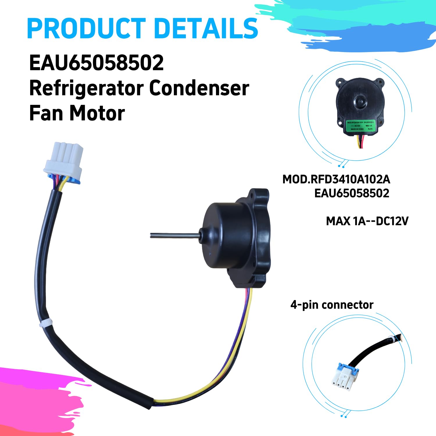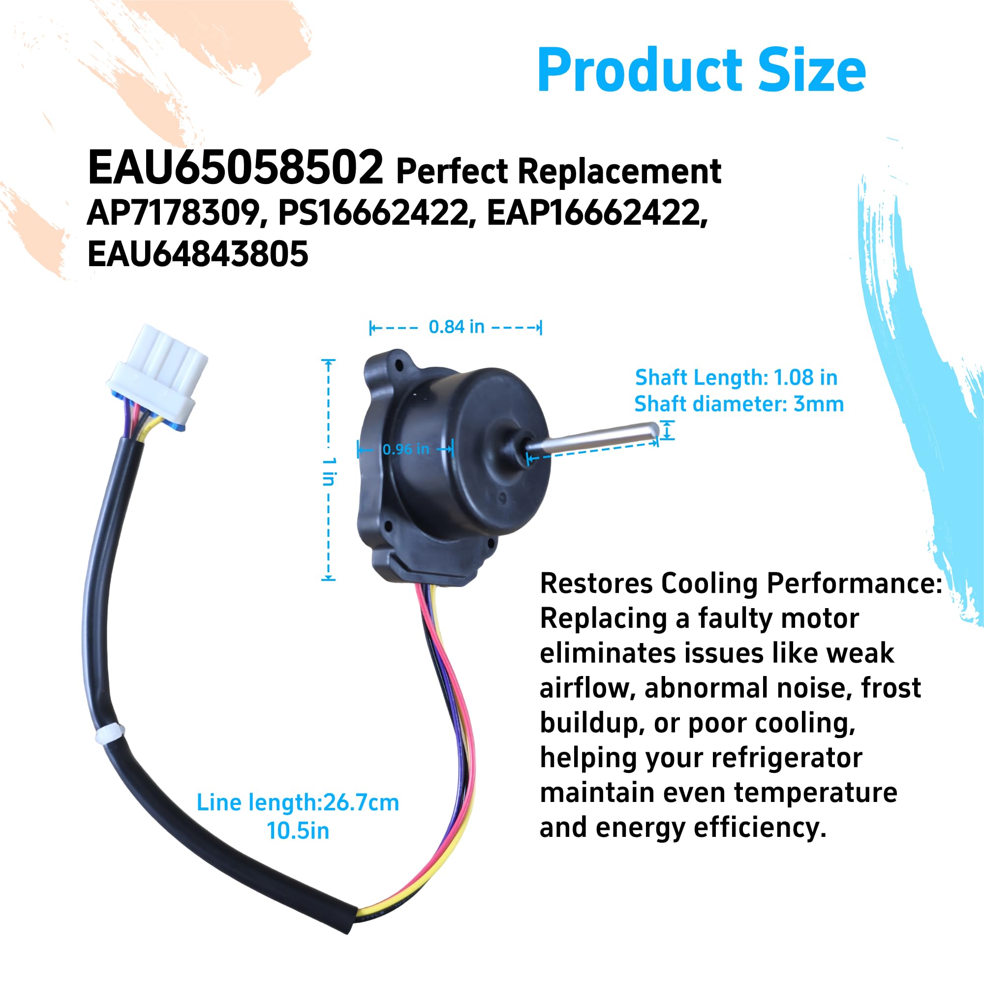 OEM-Quality Replacement: The EAU65058502 Refrigerator Condenser Fan Motor (DC 12V, 1A, 4-pin) is built to meet OEM standards, tested for reliable, long-lasting performance, and directly replaces AP7178309, PS16662422, EAP16662422, and EAU64843805.