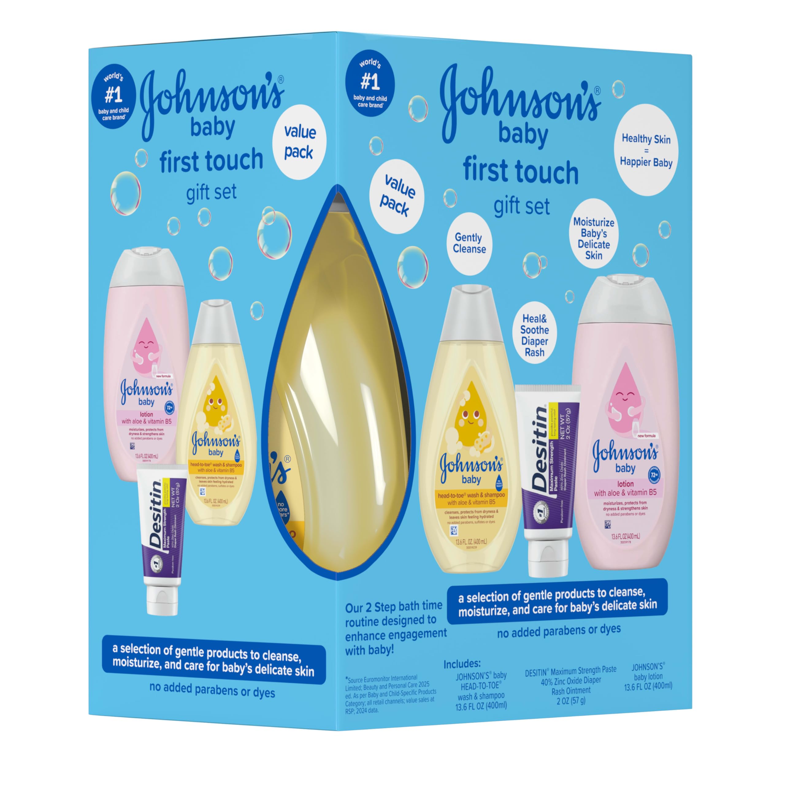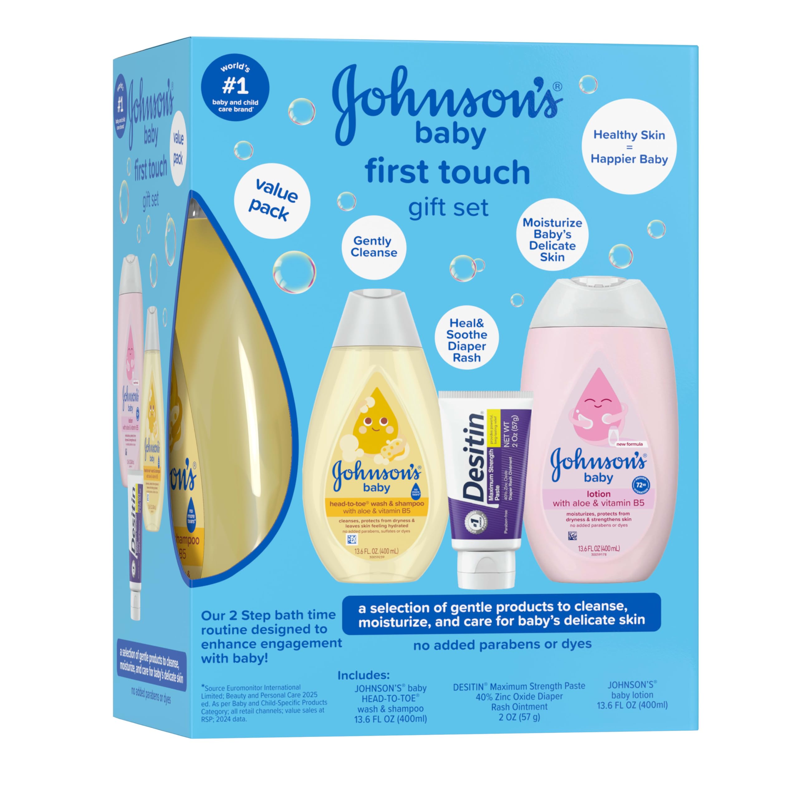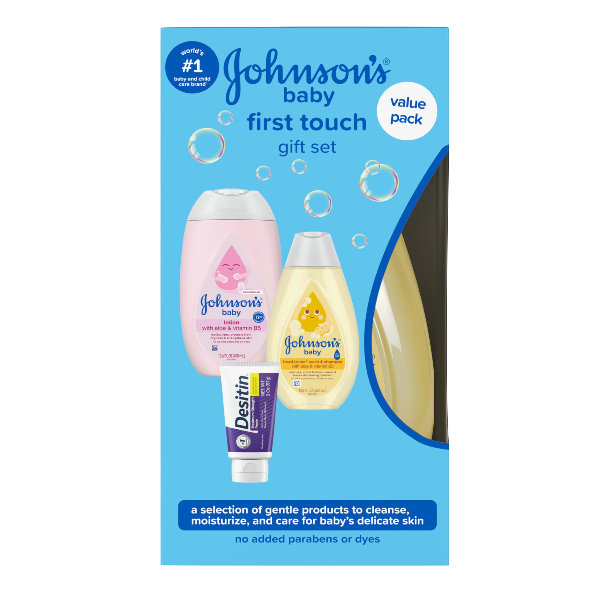 Care for your baby's delicate skin with the First Touch Gift Set from Johnson's Baby, the world's #1 baby & childcare brand.* This set makes the perfect baby shower gift for new or expecting parents. The Head-To-Toe Baby Wash & Shampoo gently cleanses baby's skin and hair without drying and is as gentle as pure water. The Moisturizing Baby Lotion with soothing aloe hydrates & nourishes for 24 hours to help maintain baby's healthy skin. The Maximum Strength Diaper Rash Paste with 40% zinc oxide from Desitin, the #1 choice of pediatricians, works on contact to treat & help prevent diaper rash discomfort by sealing out wetness. This baby set features formulas that are gentle & free of dyes, parabens & sulfates. Together, these trusted baby skincare products work to cleanse, moisturize, and protect babyβs skin. * Source Euromonitor International Limited; Beauty & Personal Care 2024 ed. as per Baby & Child-Specific Products category; all retail channels; value sales at RSP; 2023 data.