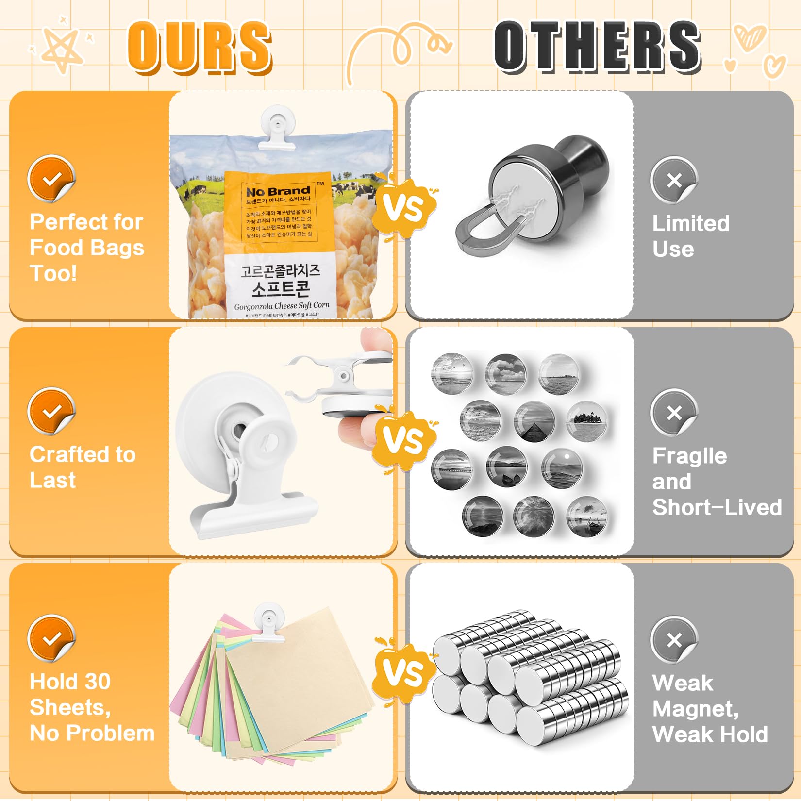 🌈Multi-Purpose: These magnetic clips are not only suitable for refrigerator notes and photos but also can be used as a food bag sealing clip to keep snack bags and frozen food bags fresh; it is also a good helper to fix documents, or hang keys. Suitable for various occasions such as kitchens, offices, garages, and schools, making life full of possibilities