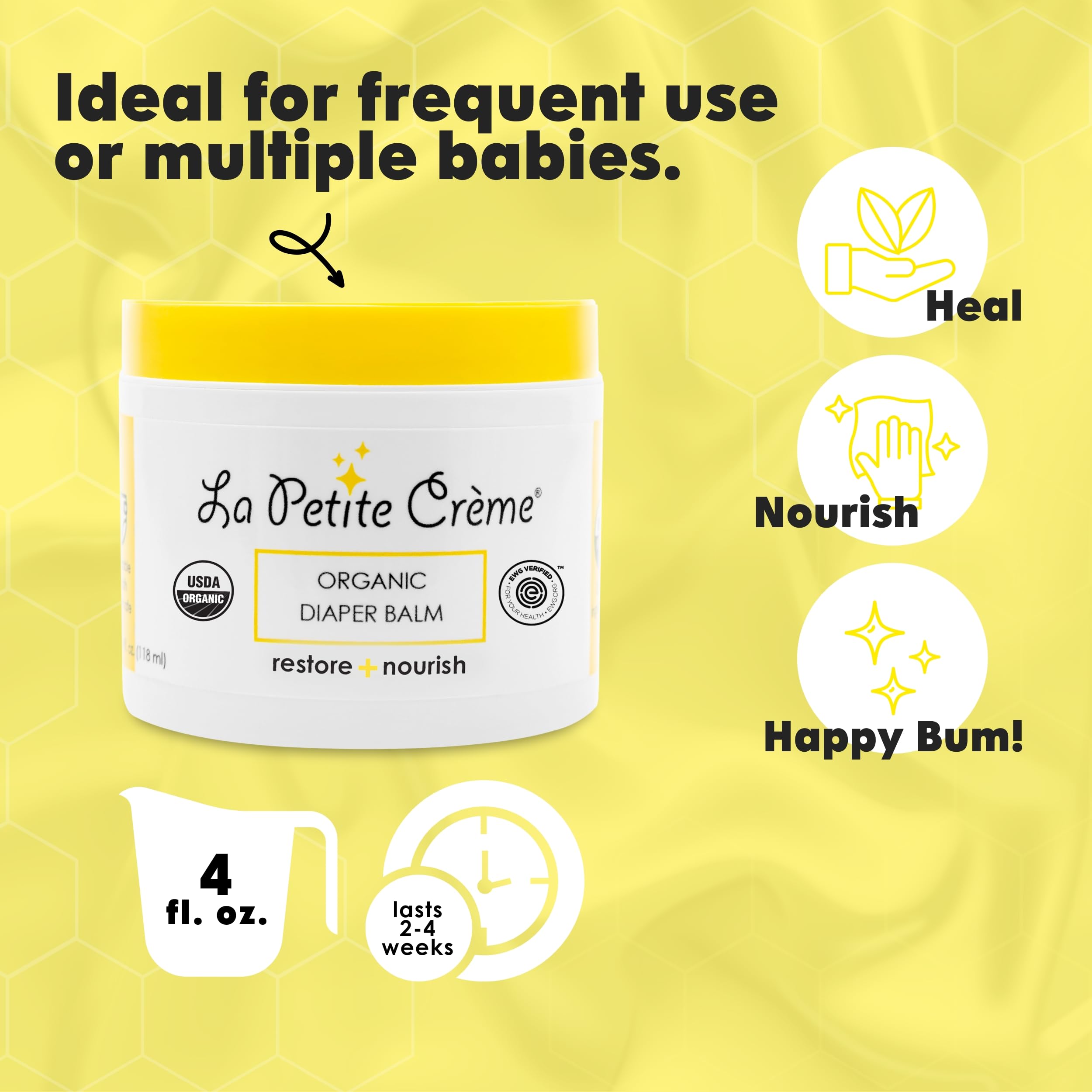 Easy to Apply: Our baby butt cream is simple to use, just apply a generous layer of the balm to heal and moisturize dry skin with your fingers or a cotton ball. An ounce of our baby butt paste lasts for up to 1-2 months. For the best outcomes, use this baby diaper cream after cleaning with La Petite Creme diapering lotion.