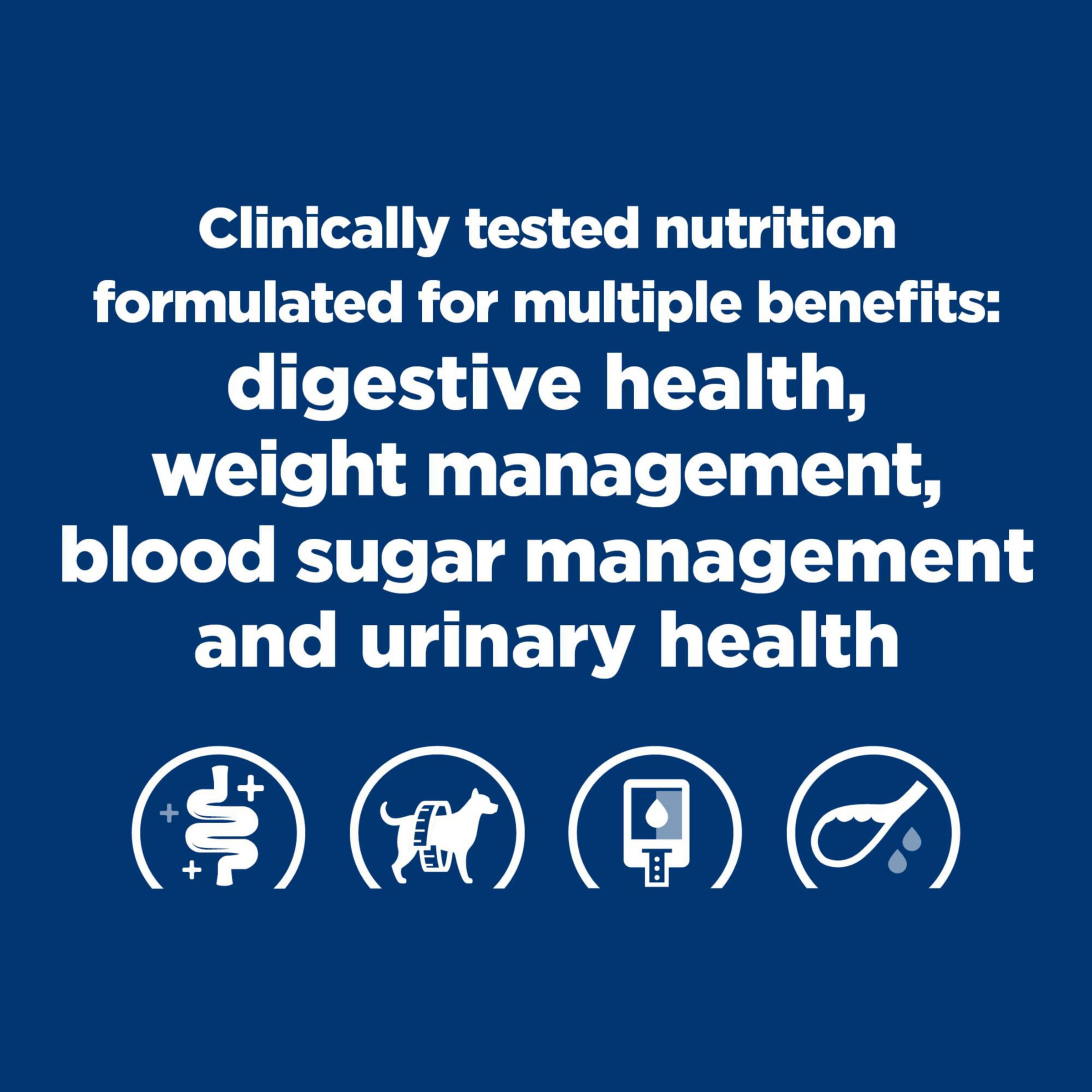 When your pet is experiencing multiple conditions at once, they are often — although not always — interconnected. That's why Hill's Prescription Diet w/d is uniquely formulated to benefit your pet on multiple levels: urinary health, digestive health, blood sugar management and weight management. This blend of balanced nutrients and soluble and insoluble fibers works on multiple fronts to get your pet live their best life.