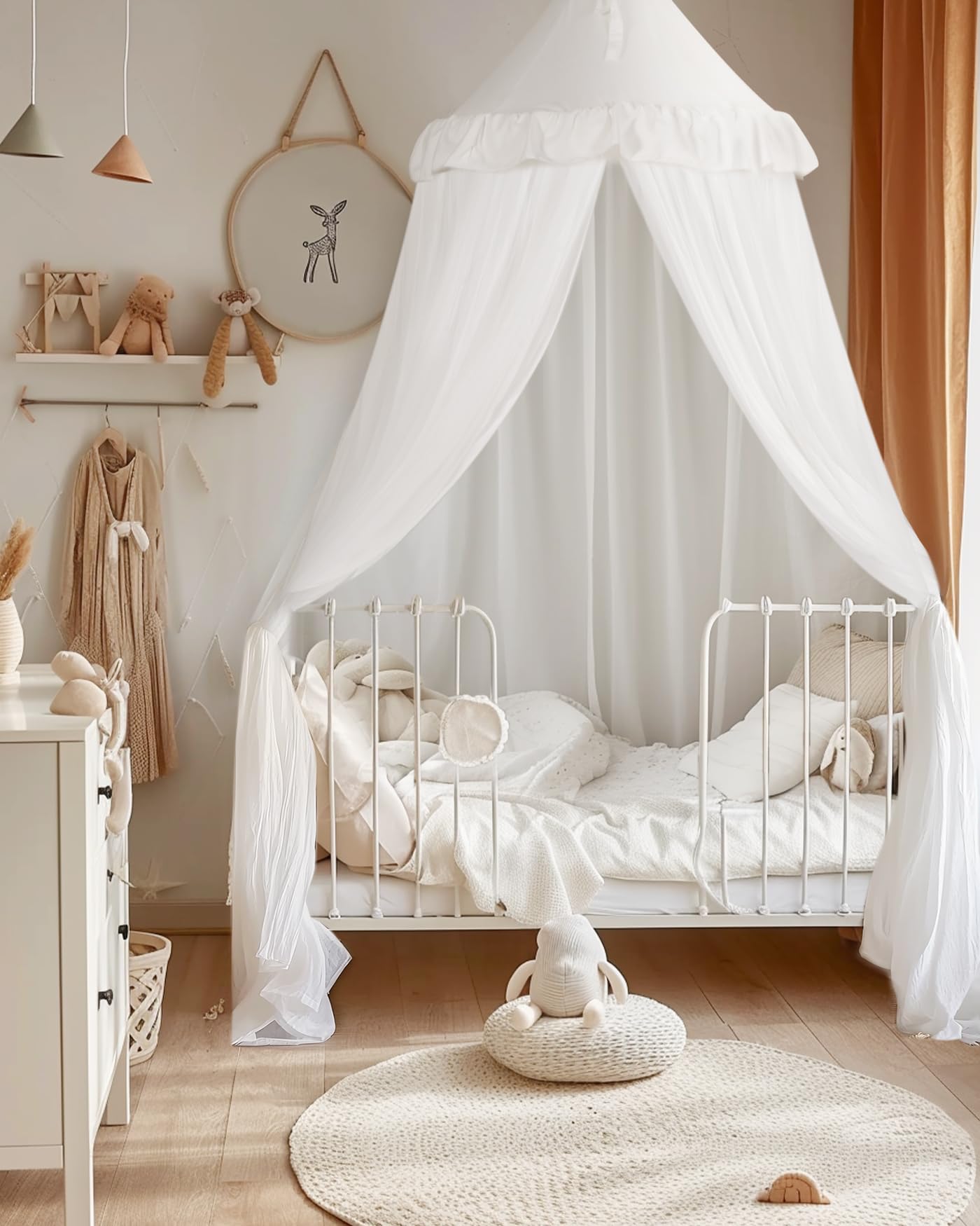 WIDE APPLICATION: 25.6 inches diameter at the top, 92.5 inches inner lined high, 106 inches mesh high, 315 inches around the bottom. It’s suitable for different sizes, including bassinets, cribs, child's beds, and single beds. Additionally, you can also use it for a play mat or a cozy reading corner. It's a great way to enjoy your own private moments of joy and relaxation.