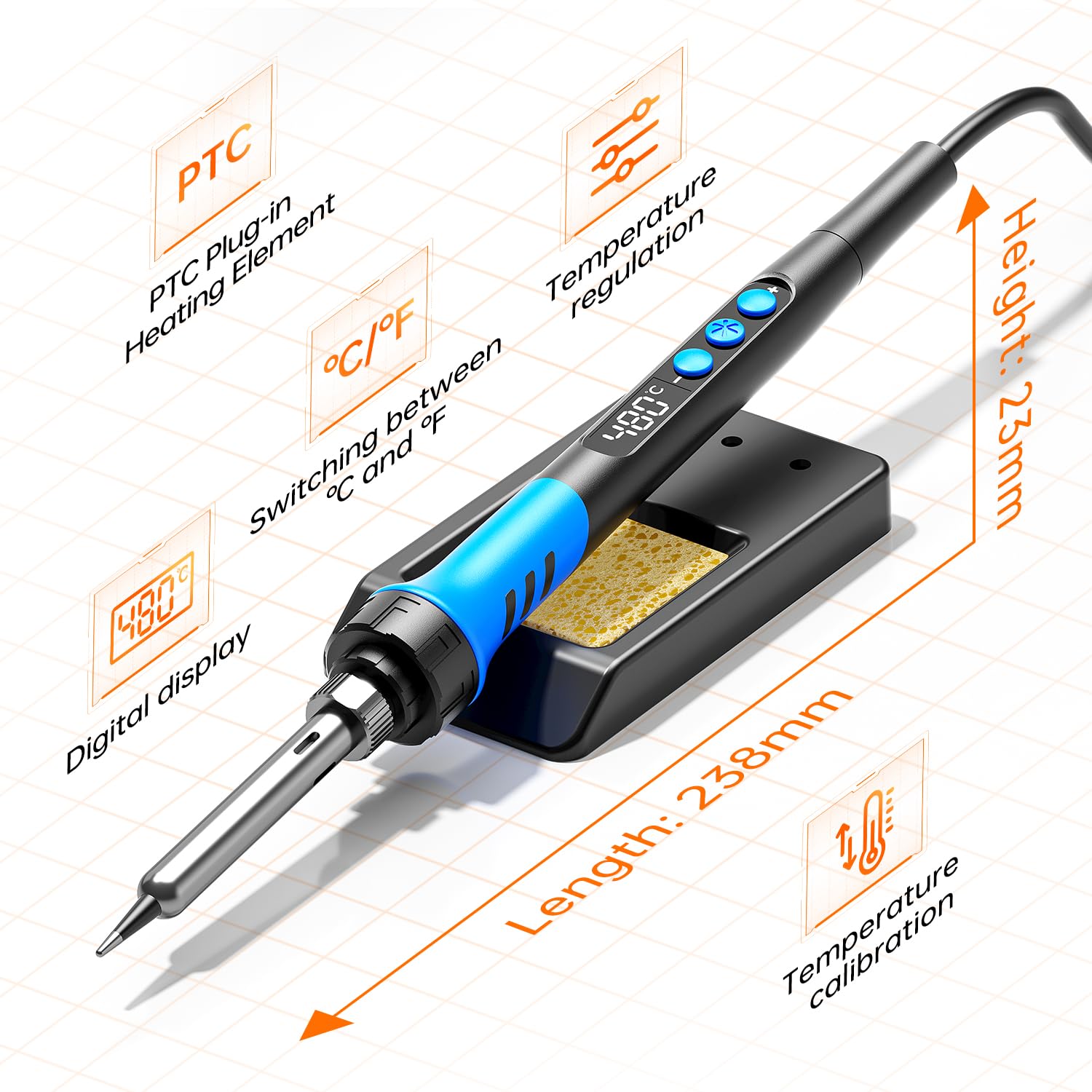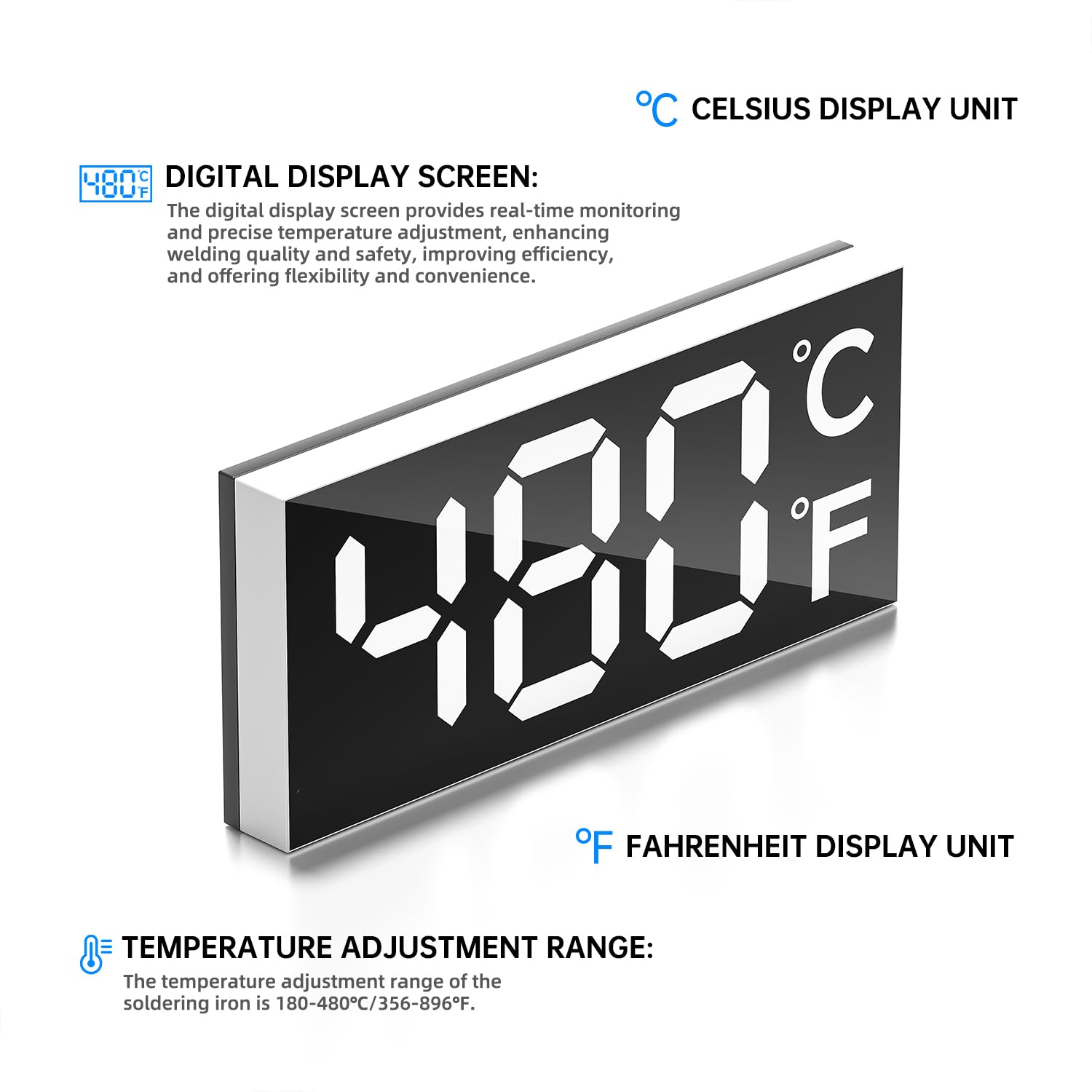 【Technical innovation】The soldering iron is upgraded to 90W high power, which can make the iron warm up quickly; this iron can adjust the temperature accurately, the temperature can be set flexibly to 180℃-480℃
