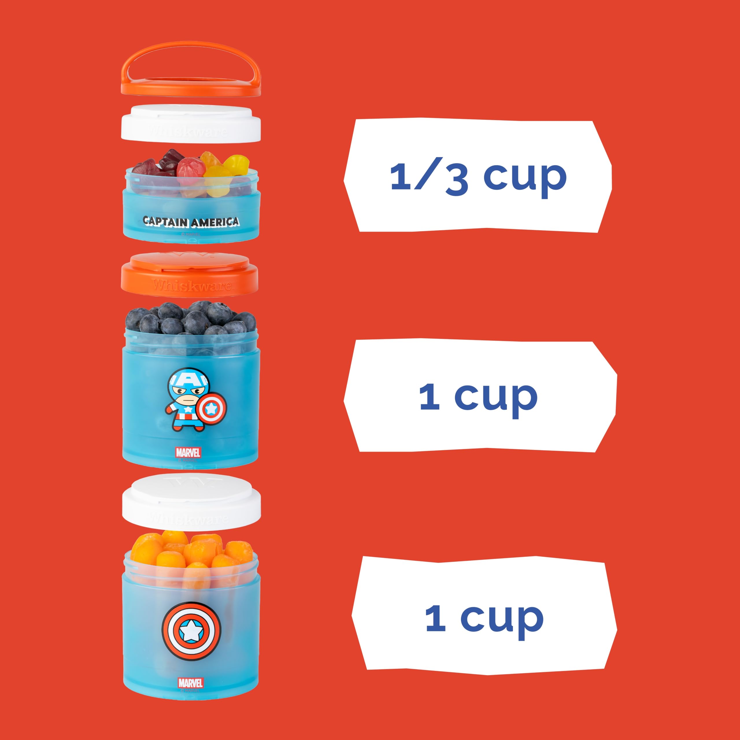 Includes 3, cupholder friendly jars, measuring 1/3 cup, 1 cup, and 1 cup