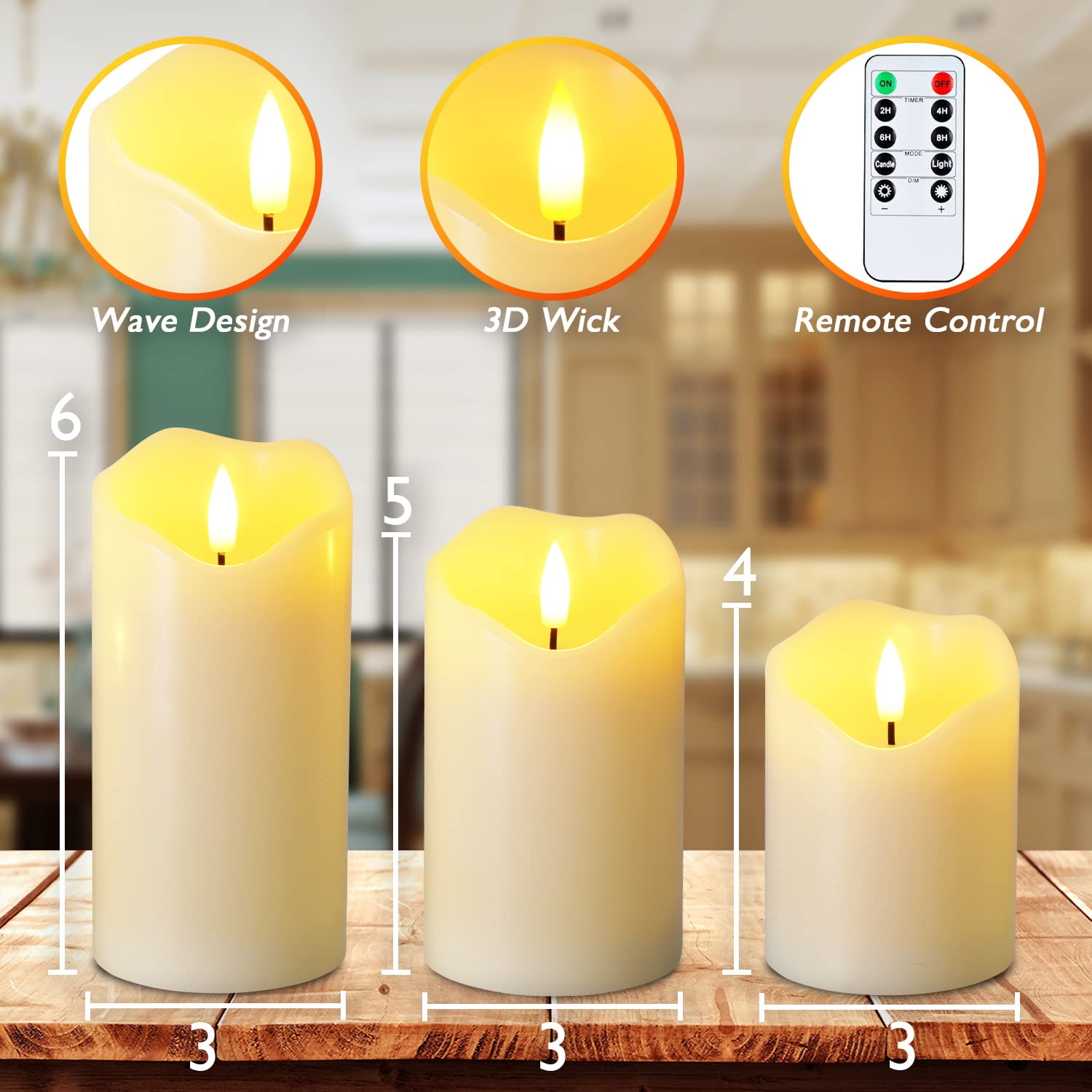 Safe & No Fire Risk: With amazing LED pillar candles set, you can have perfect ambient evenings with peace of mind; no worries about fire hazards, smoke, messy dripping wax, or stained tablecloth. Safe To Use Around Children and Pets.