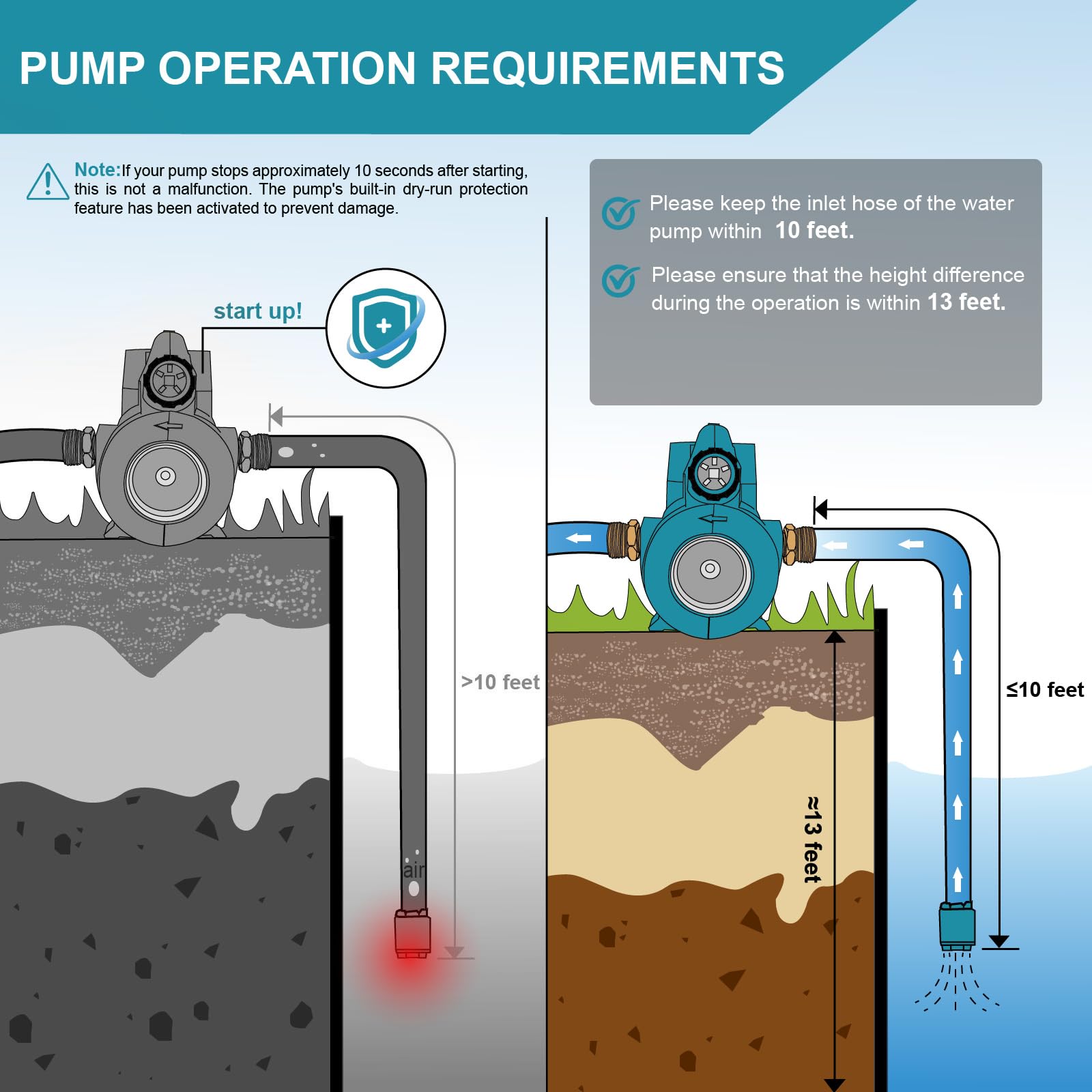 Self-Priming Transfer Pump: With the innovative self-priming pump, you can connect and go quicker than ever. The Mellif mini utility transfer pump can deliever water up to 430 GPH. Max head height: 60 FT, Max suction lift: 6 FT, Max flow: 430 GPH. For best performance, make sure the inlet hose length does not exceed 10ft