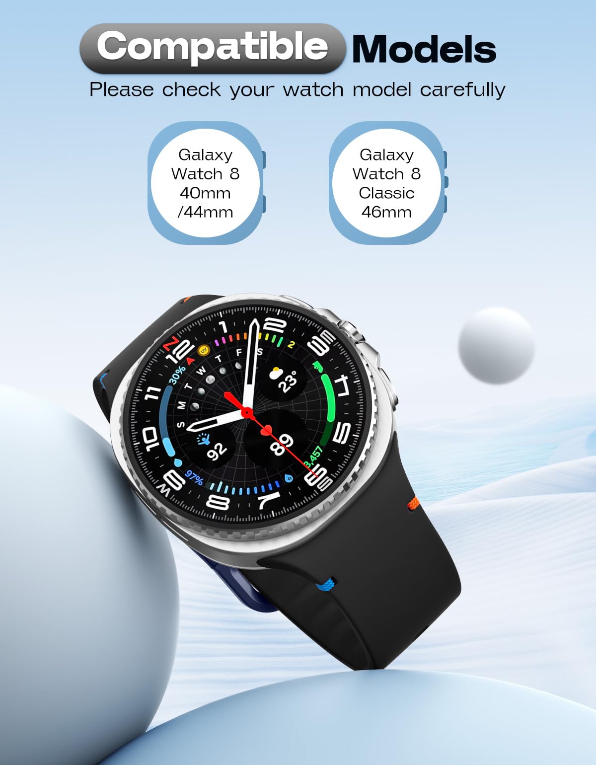 Compatible Models: This soft silicone band is only compatible with Samsung Galaxy Watch 8 band 40mm/44mm and Galaxy Watch 8 Classic band 46mm. Note: Smartwatches are not included.