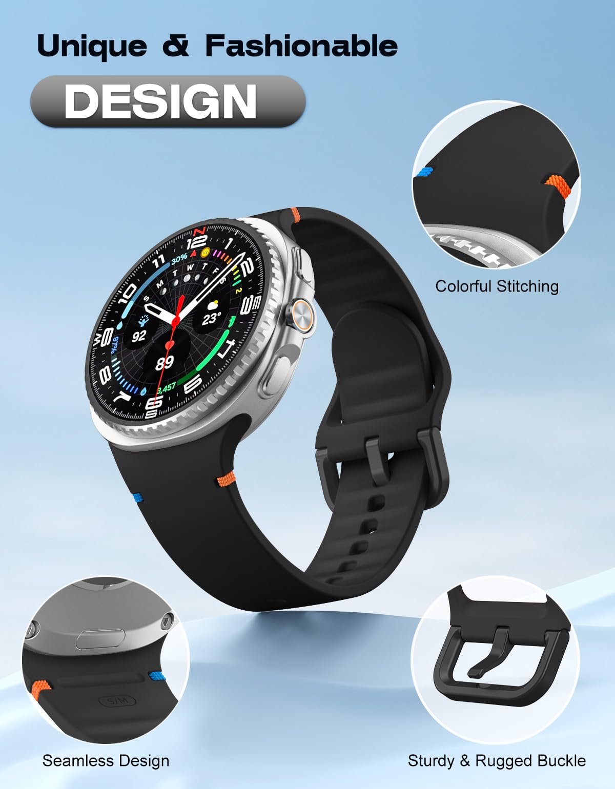 Seamless Design: The Galaxy Watch 8 band is accented with colorful stitching, adding a touch of elegance to your wrist, and the rippled design inside the band allows for easy drainage and quick drying of sweat. It has a lugless design that blends seamlessly into the body of the watch, ensuring a sleek look and comfortable fit, especially during intense exercise.