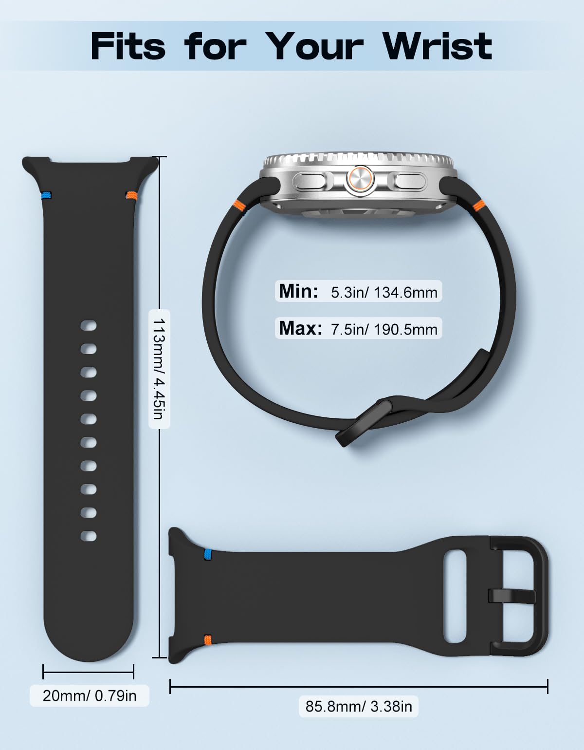 Wrist Size: The Galaxy Watch 8 40mm band is available in a variety of colors to match different outfits and moods. Suitable for women and men. It is adjustable, S/M fits 5.3" - 7.5" (134.6 mm - 190.5 mm) wrists and M/L fits 6.1" - 8.7" (154.9 mm - 221 mm) wrists. The metal buckle holds the watch securely in place, and you can also tuck the band underneath.