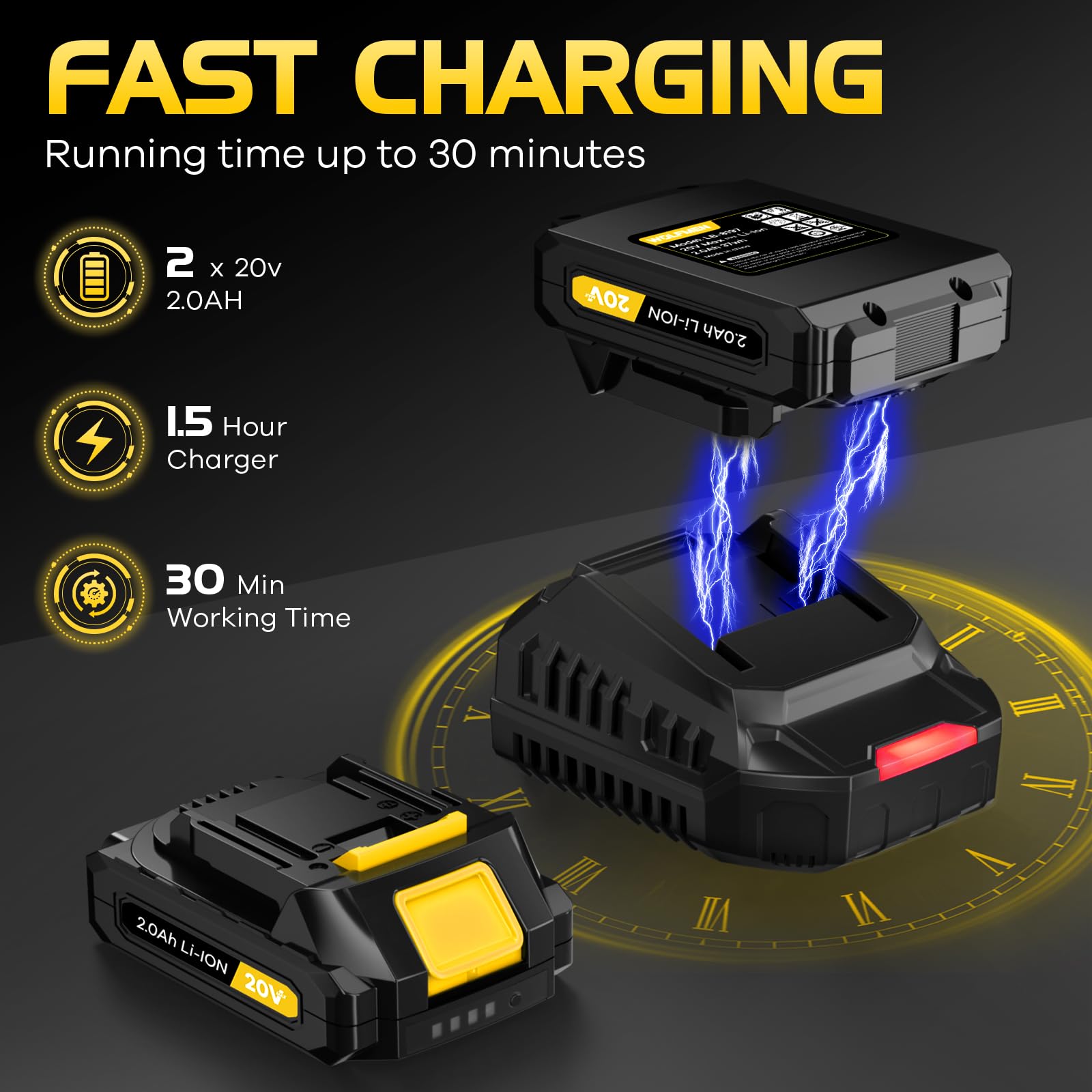 Powerful Motor: WOLFMEN leaf blower adopts advanced axial flow turbofan, up to 450 CFM and 150 MPH, effectively improving air volume and wind power. It is equipped with a charger and 2 x 20v 2.0 Ah batteries, which can be used alternately. Each battery can work for up to 30 minutes (low speed)