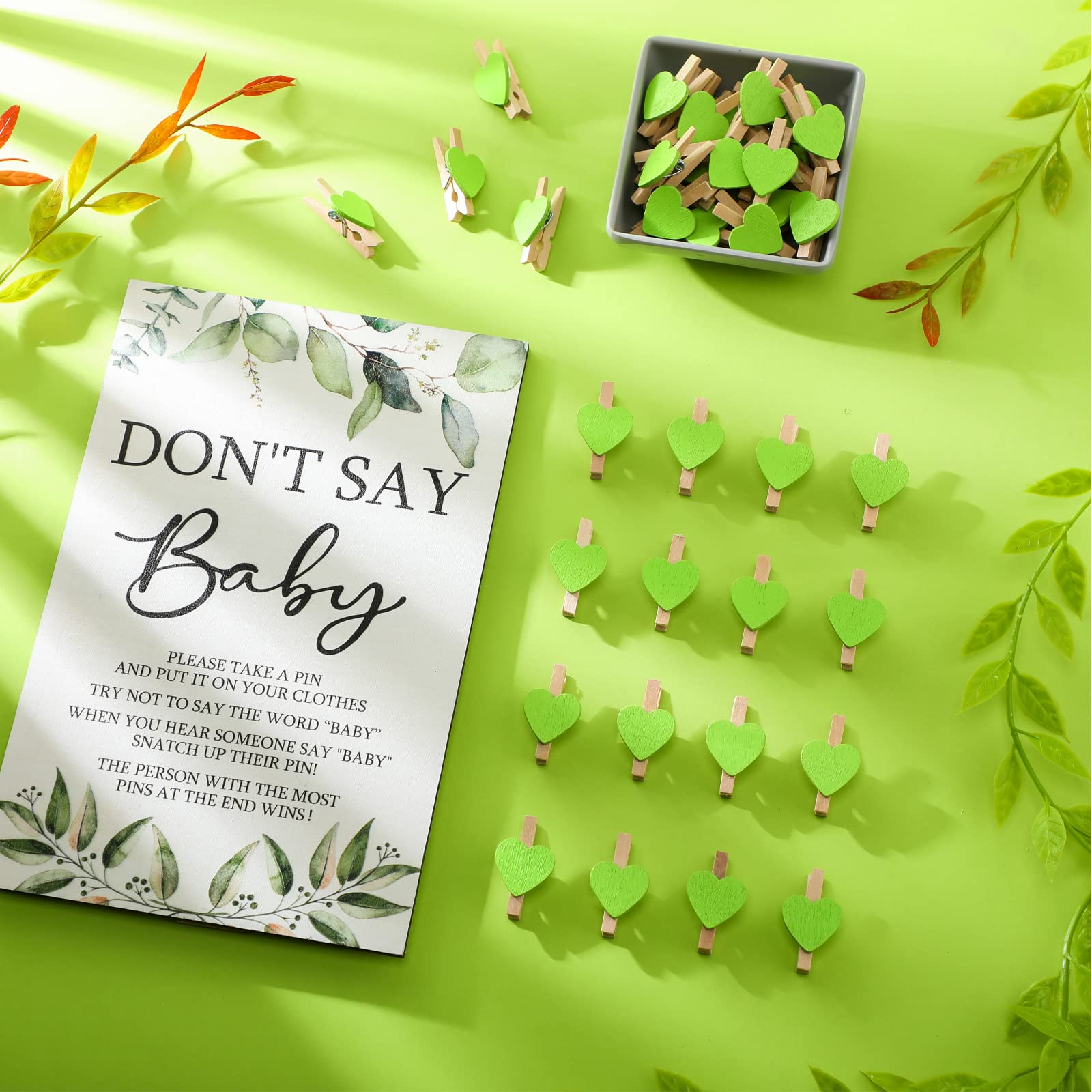 What Will Get: the package contains 1 set of don't say baby game supplies, including 1 piece of greenery theme wooden don't say baby sign, 50 pieces of greenery wooden clothespins, enough and complete to meet your party needs