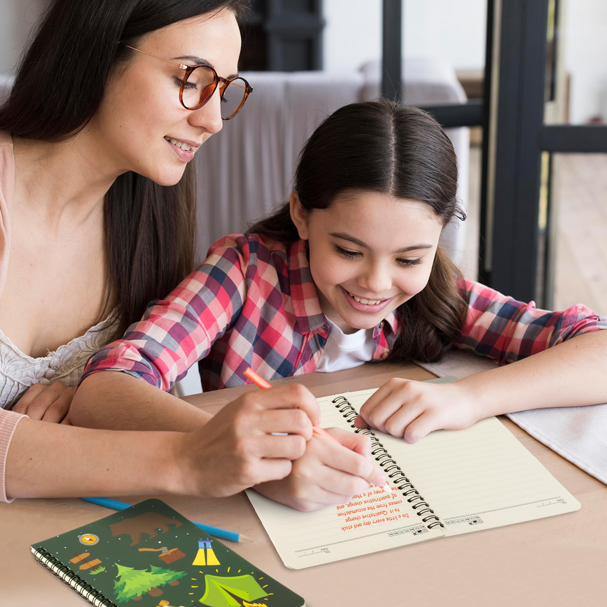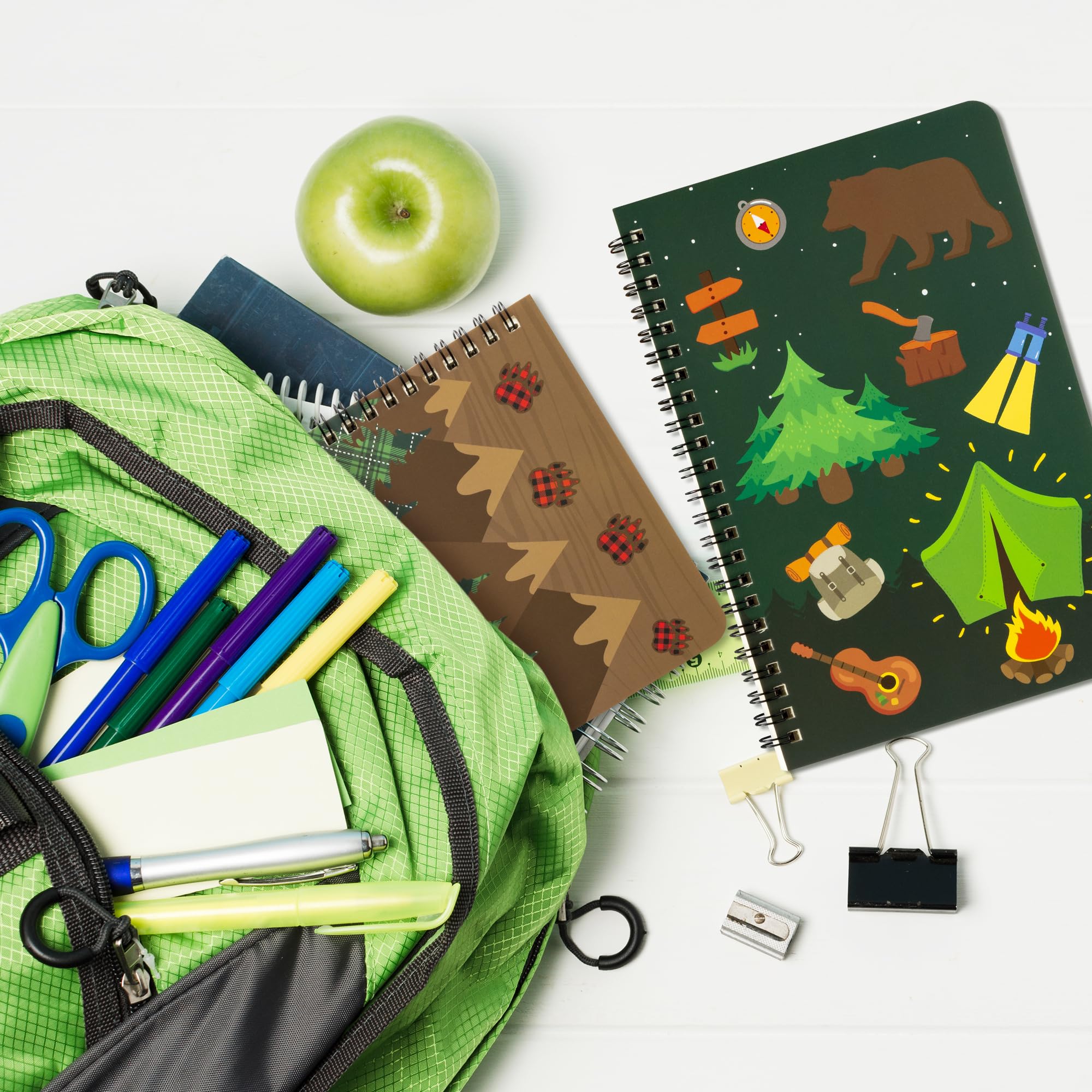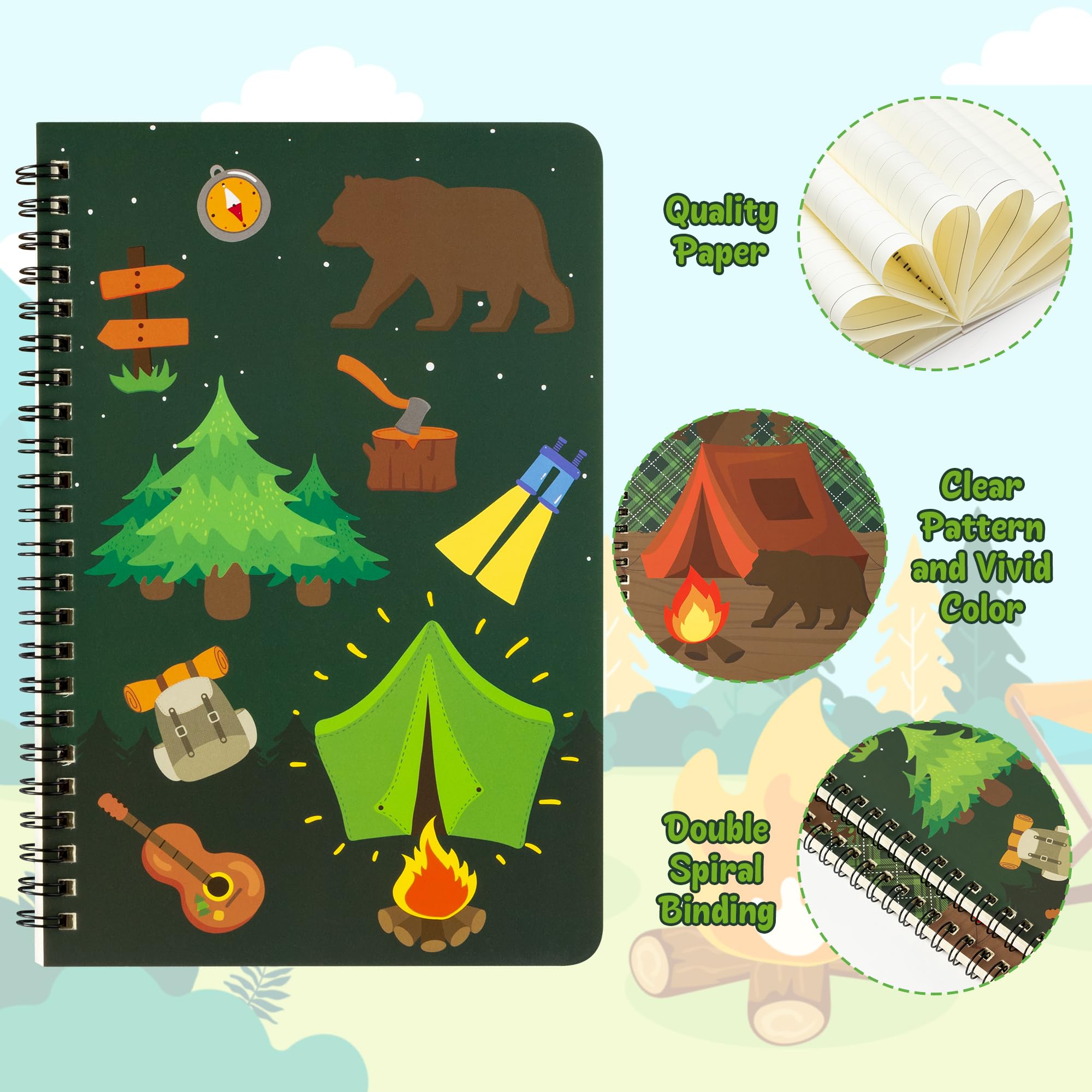 Camping Spiral Notebook: You will get 2 pack camping themed spiral notebooks in different designs, and the notebook is 50 sheets and 8.3 x 5.5 inches. The cover designed with camping element-tent, bear, trees, backpack, etc., which is visually appealing notebooks