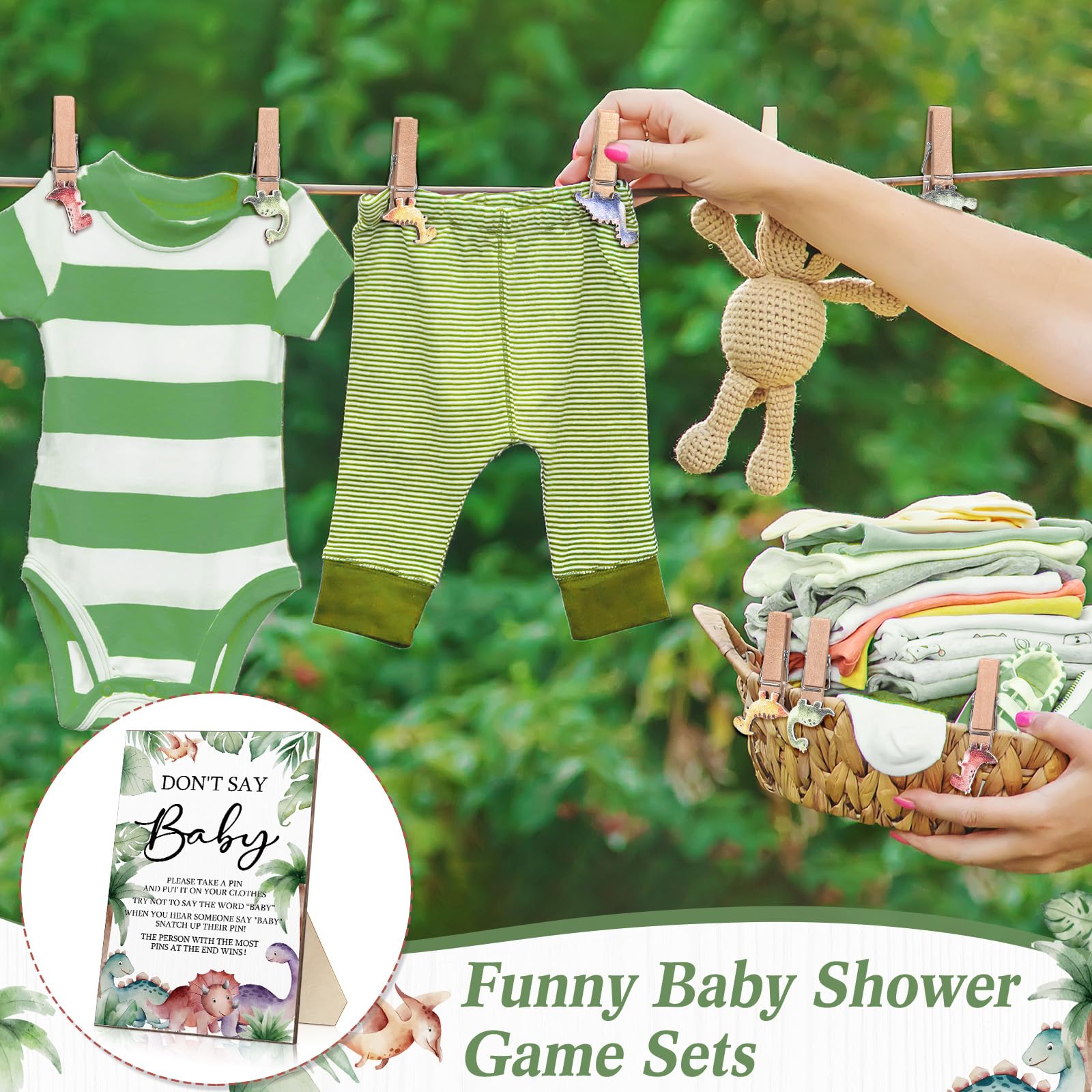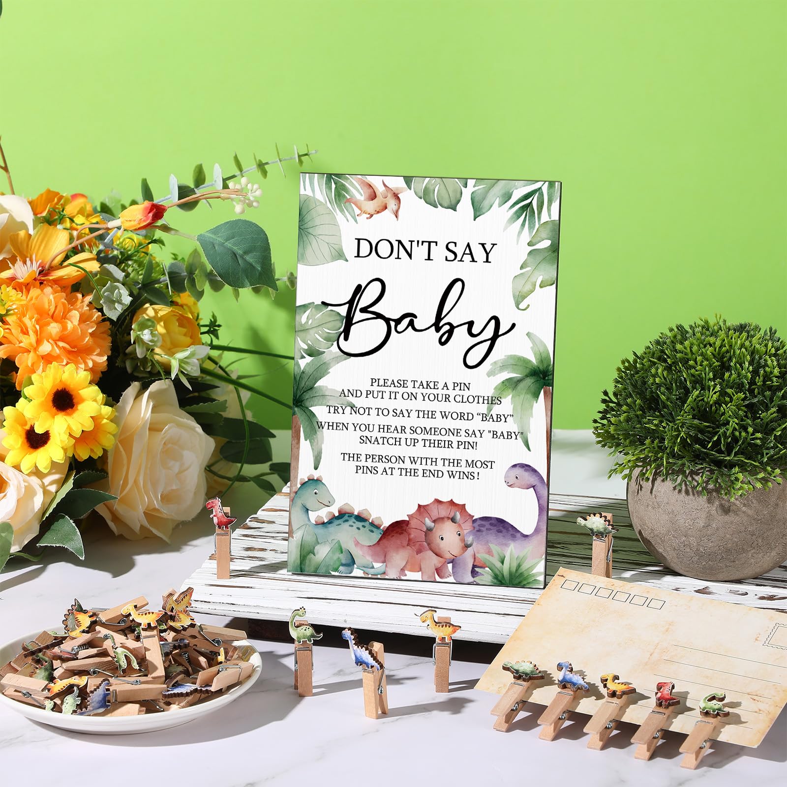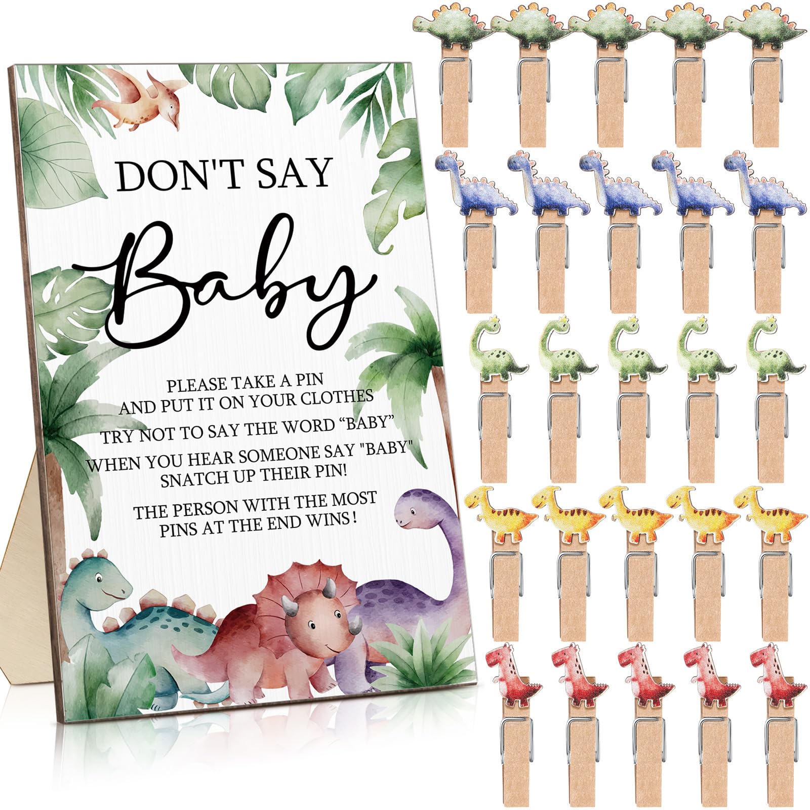 What Will Get: the package contains 1 set of don't say baby game supplies, including 1 piece of dinosaur theme wooden don't say baby sign, 50 pieces of dinosaur wooden clothespins, enough and complete to meet your party needs