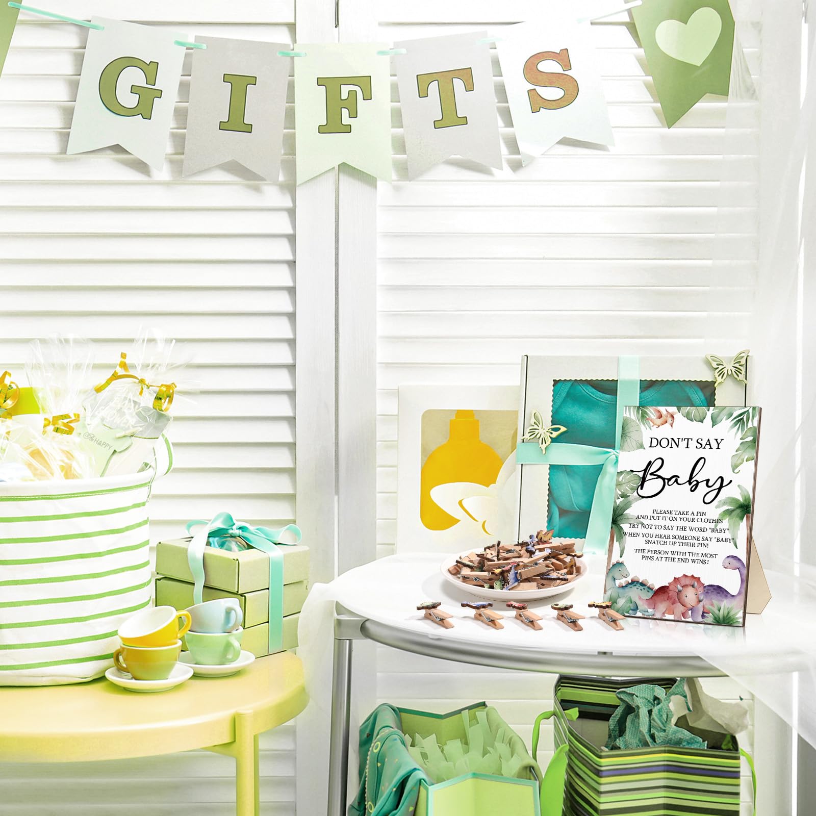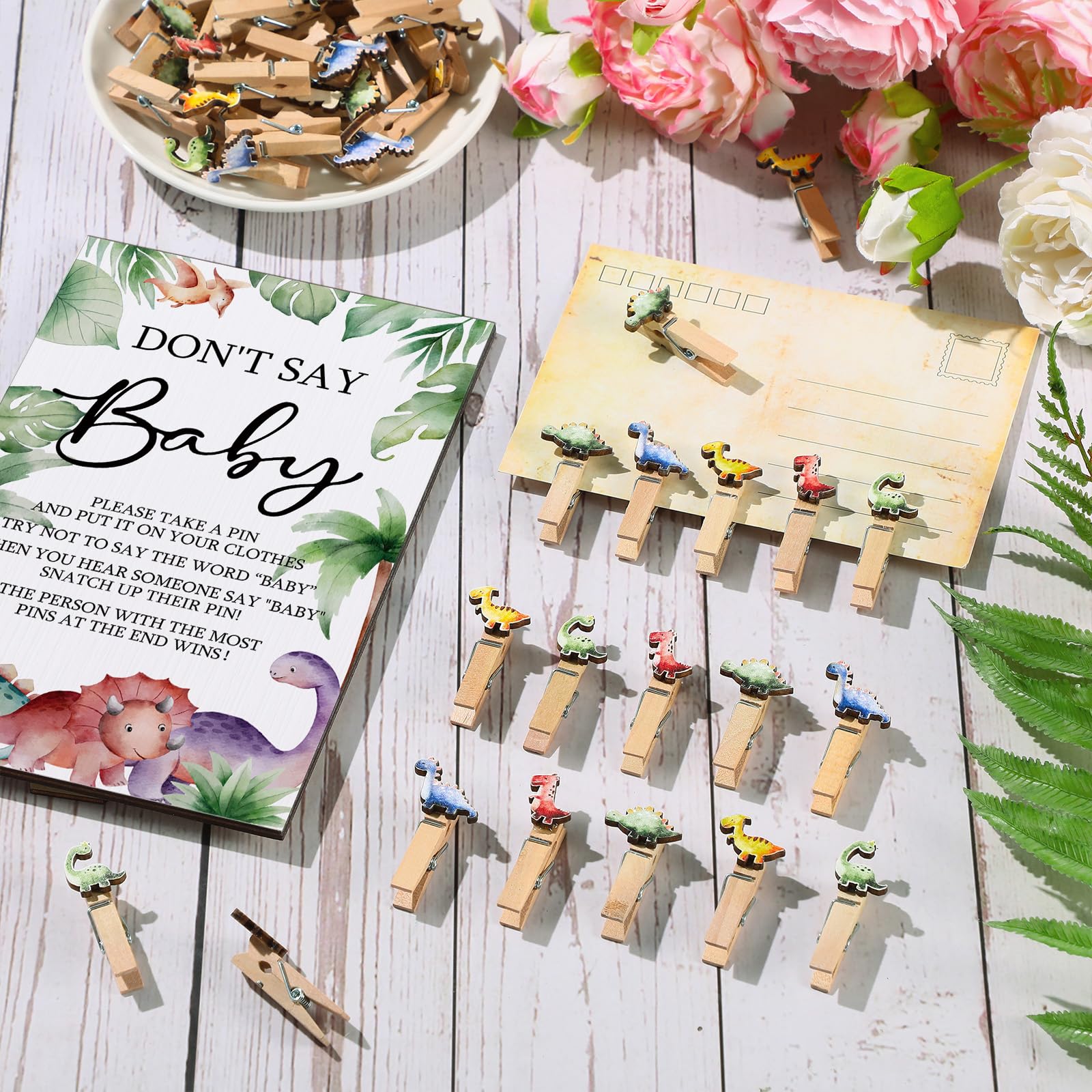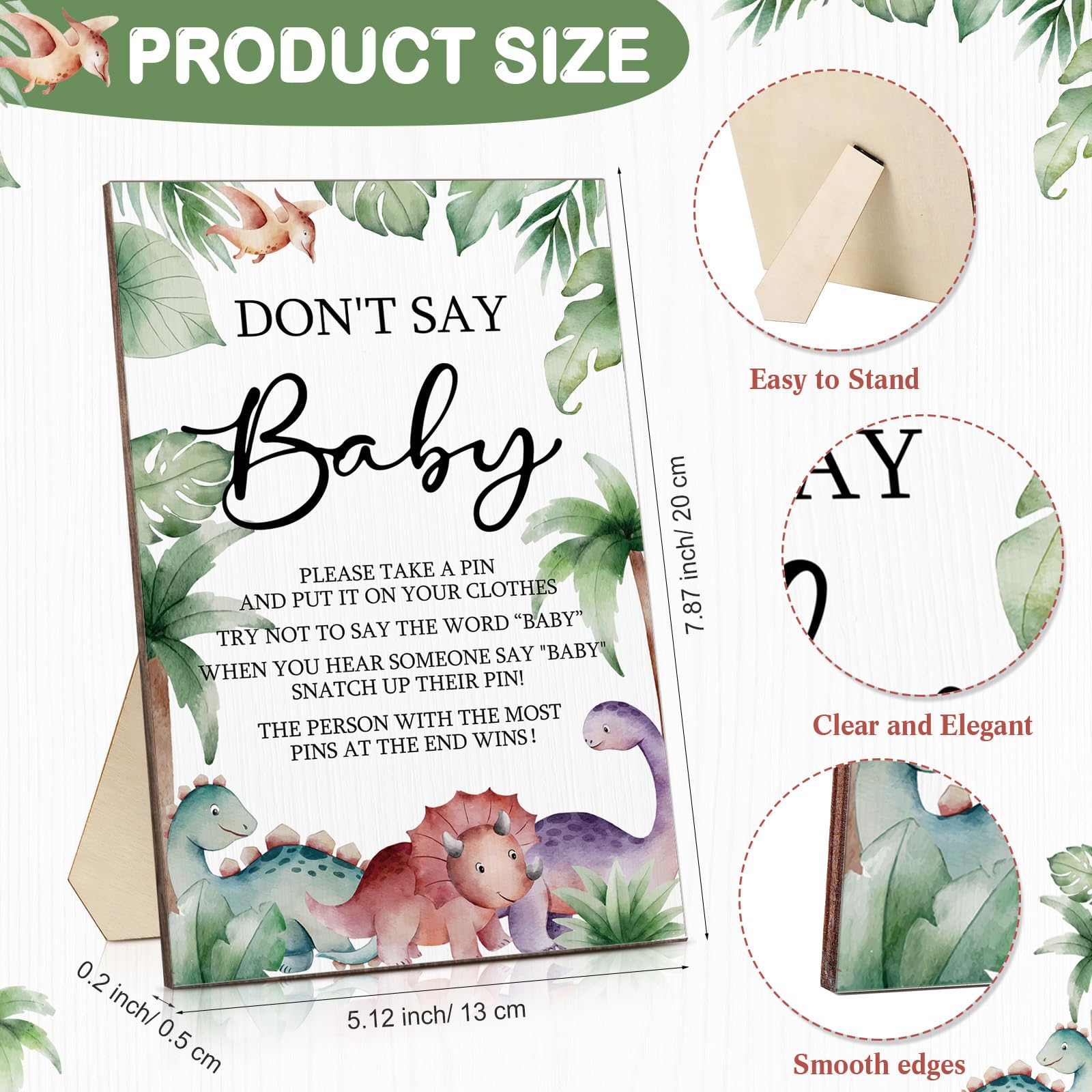 What Will Get: the package contains 1 set of don't say baby game supplies, including 1 piece of dinosaur theme wooden don't say baby sign, 50 pieces of dinosaur wooden clothespins, enough and complete to meet your party needs