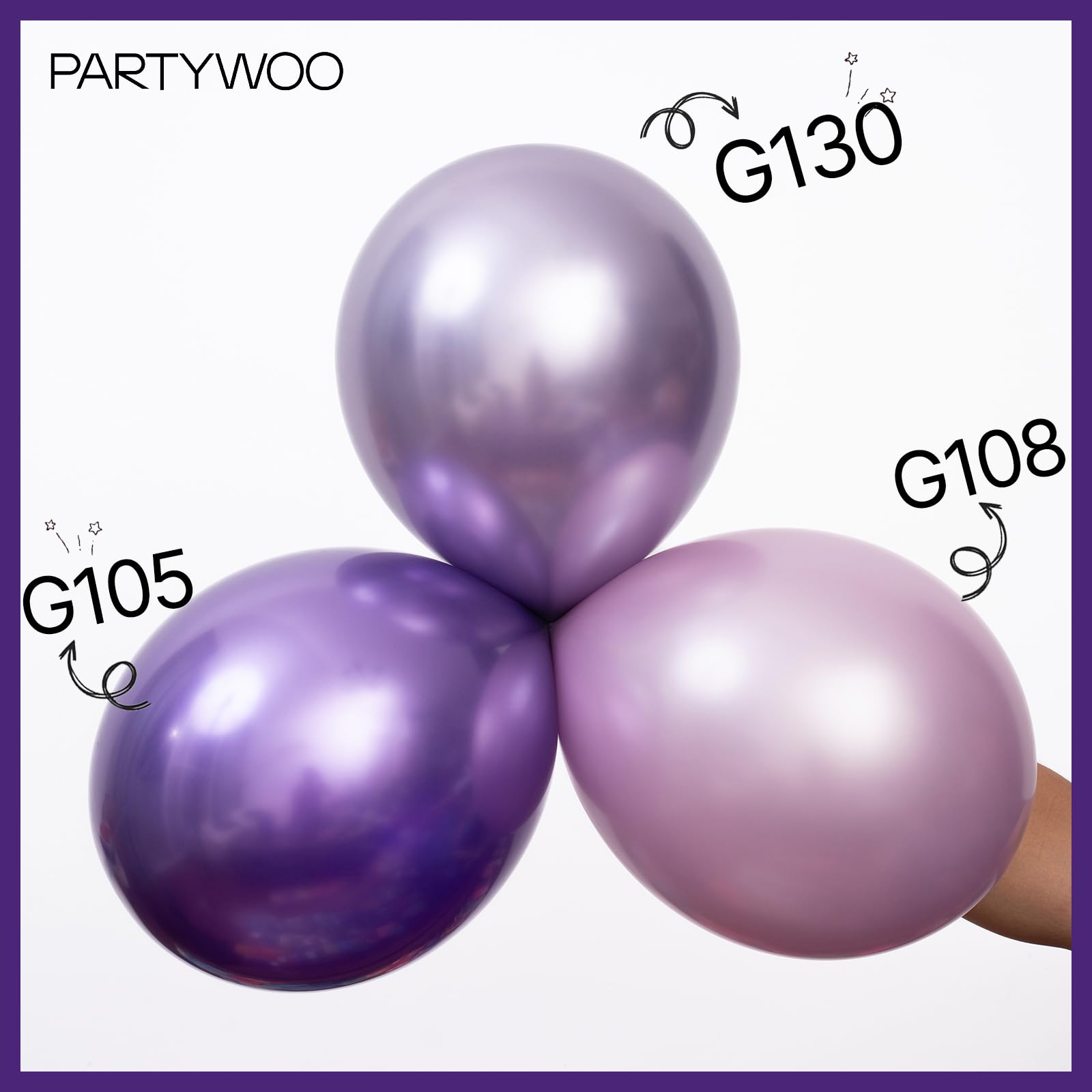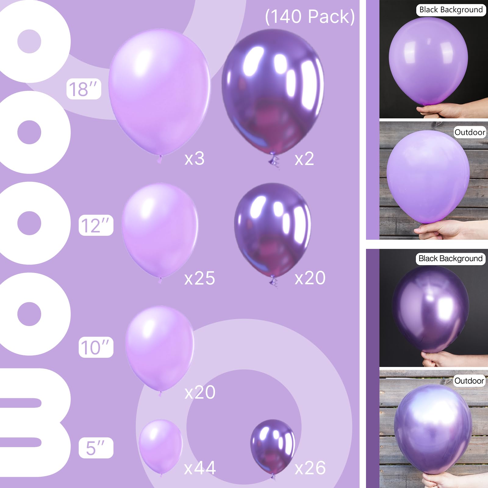 140 pcs LILAC AND METALLIC PURPLE BALLOONS DIFFERENT SIZES: Package includes 18 inch balloons 5 pcs, 12 inch balloons 45 pcs, 10 inch balloons 20 pcs, 5 inch small balloons 720pcs, balloon decorating strip included