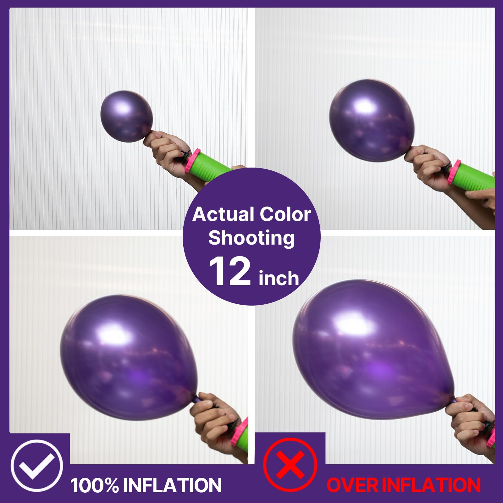 ATTENTION & WARNING: Please DO NOT overfill the balloons and also avoid sunburn, overheat, pointed object and excessive friction. Control the amount of air inflated into each balloon to achieve your ideal balloon size