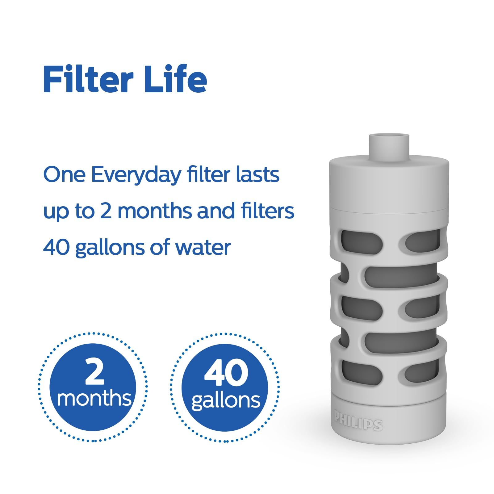 One Everyday filter filters up to 40 gallons of water and lasts up to 2 months.