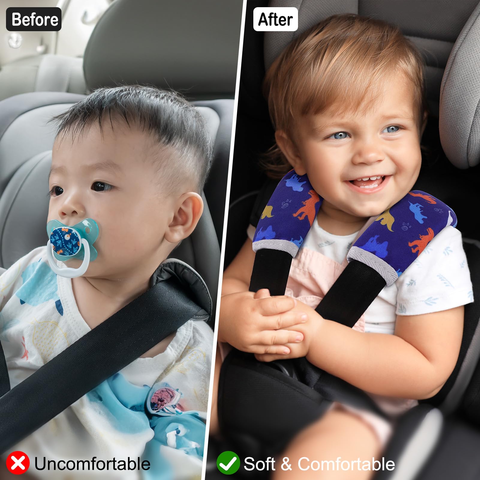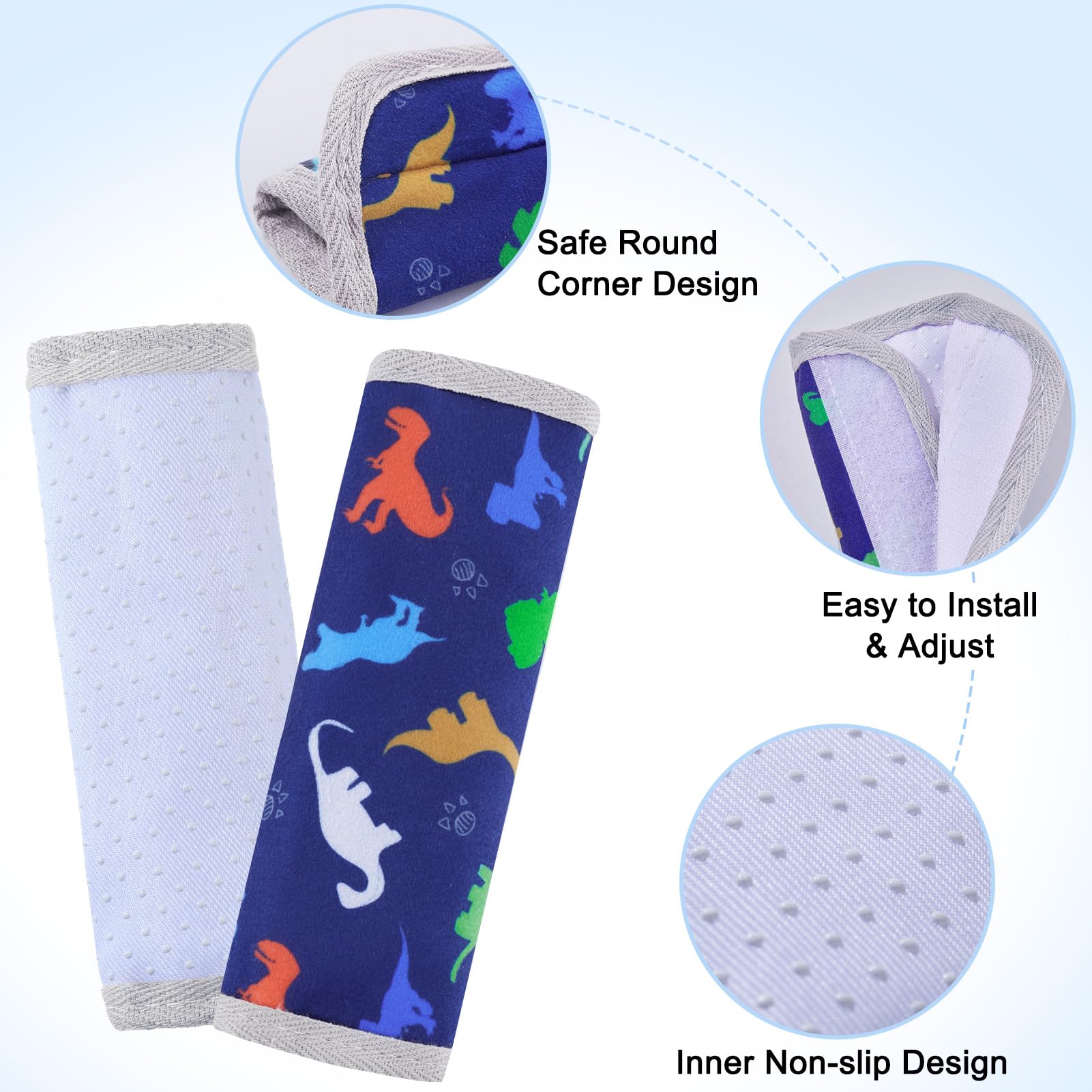 Universal Size & Anti-Slip: Our seatbelt covers for kids come in two sizes—small (5.9 × 2.6 inches) and large (9.4 × 6.3 inches)—specially designed for babies and kids, fit most car seats, strollers and pushchairs; The inside of the seat belt covers is an anti-slip design, keeping it in place with no sliding
