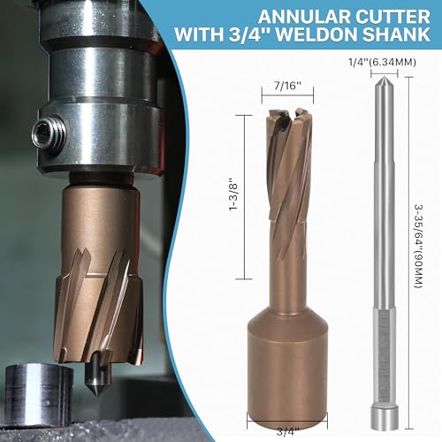 【Specifications】 - KEENTECH annular Cutter with features a premium carbide cutting edge for outstanding durability, making it ideal for drilling harder materials like stainless steel. It offers a 7/16" cutting diameter and a 1-3/8" cutting depth, and comes with a free pilot pin. The 3/4" weldon shank design is compatible with various magnetic drills, including but not limited to Alfra, Evolution, Dewalt, and Hougen.