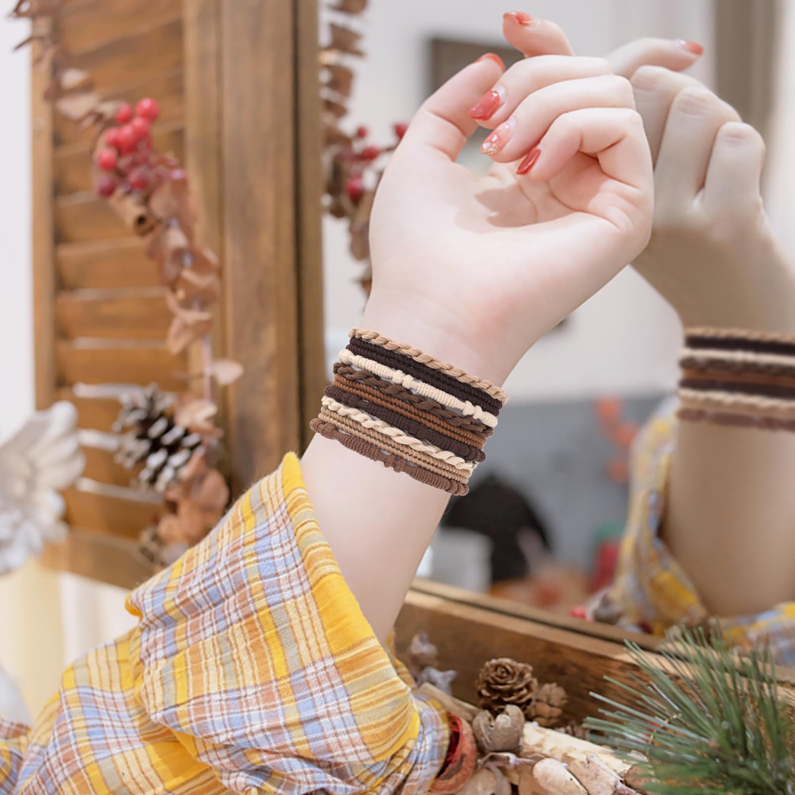 【Various Usages】No damage hair ties are very versatile. You can not only use them to tie your hair up, but also wear them on your hands as decorative bracelets. You can use them when you are washing up, cooking, doing yoga, working, etc.