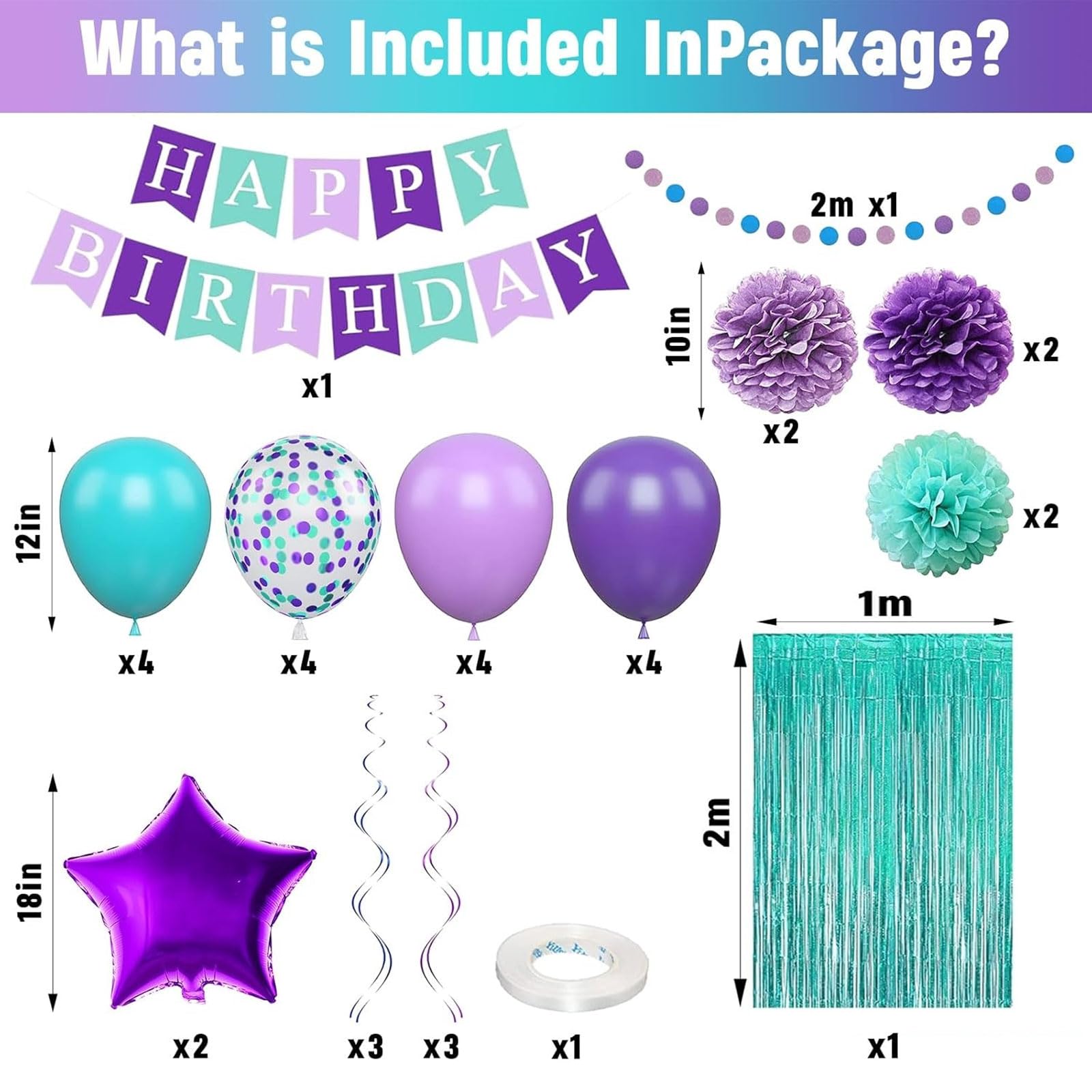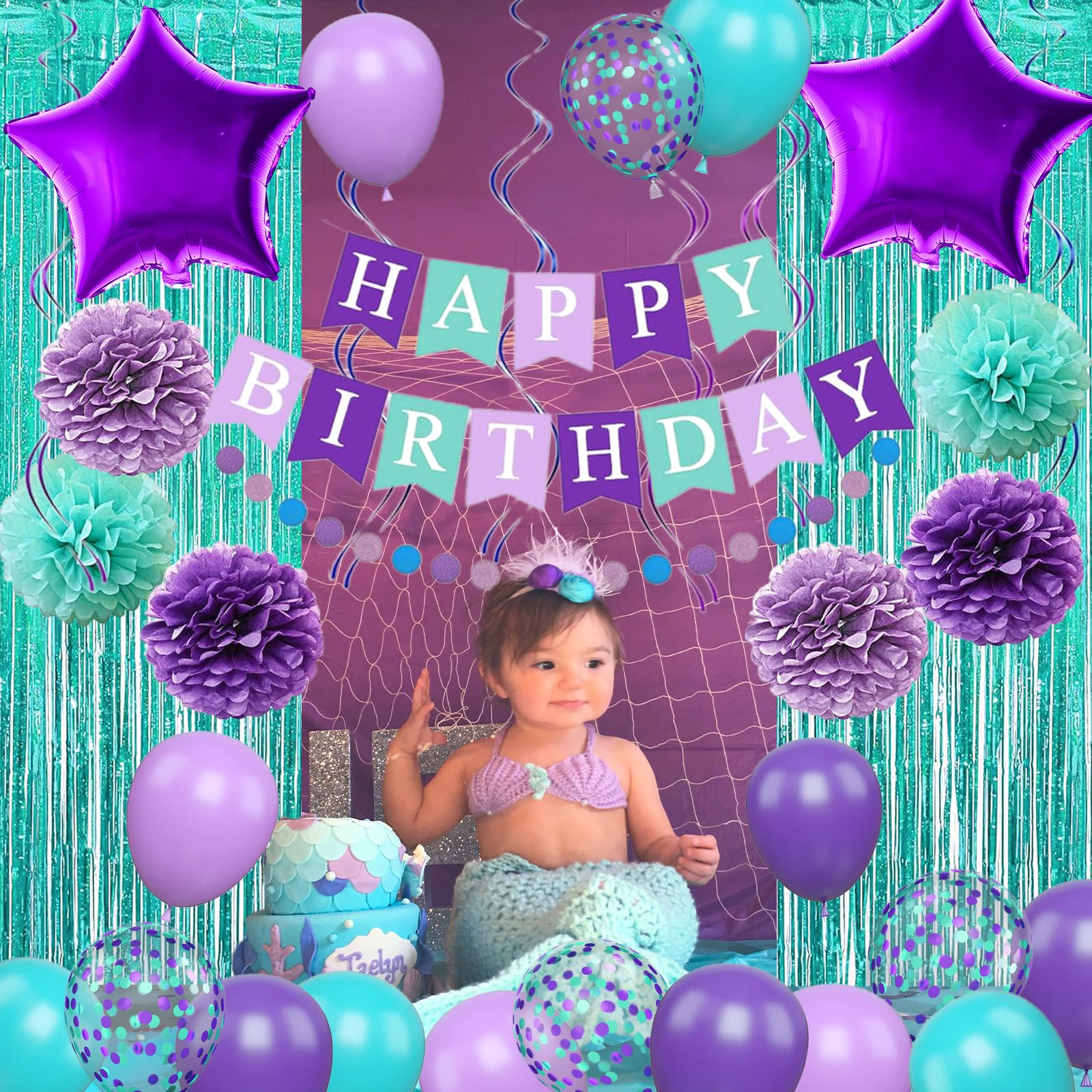 Mermaid Birthday Party Decorations for Women Girls Men Boys - Create Unforgettable Celebrations π Make birthday a truly memorable occasion with our stunning Purple Teal Birthday Party Decorations for her. This comprehensive mermaid party decoration set is perfect for mermaid unicorn birthday party, wedding party decoration, baby shower, bridal showing, wedding, engagement, anniversary, New Year party decoration etc. β¨ Package Included - π 2pc 100cm/40inch * 200cm/78.7inch teal blue tinsel curtain backdrop π 2pcs purple pom poms π 2pcs light purple pom poms π 2pcs teal green pom poms π 1pc mermaid happy birthday banner π 6 pcs hanging spirals(3 purple/3 blue) π 2pc 18inch purple star foil balloon π 1 string glitter circle dots garland π 12inch 4pcs purple mint green confetti confetti balloons π 4pcs dark purple birthday balloons π 4pcs light purple party balloons π 4pcs turquoise blue balloons π 1pc balloon ribbon. β¨ Specification- π Material: Crafted with high-quality late and thick cardboard materials, our mermaid party balloons are built to last and create a lasting impression. The mermaid color palette exudes elegance and sophistication, adding a touch of luxury to the celebration. π Inflatable- Air or Helium. Large quantity of latex purple blue teal birthday balloons set are perfect for creating a stunning balloon arch, balloon garland, or balloon bouquet. You can mix and match the number to create a unique and personalized look that matches your event's theme. Warm Tips - β Please do not over-inflate the balloon to avoid pop. β Due to the display of the monitor, the color may be slightly different from the actual item. β The confetti balloons come with confetti inside. After inflating, please rub carefully with carpet, silk, hair and roll the balloons.