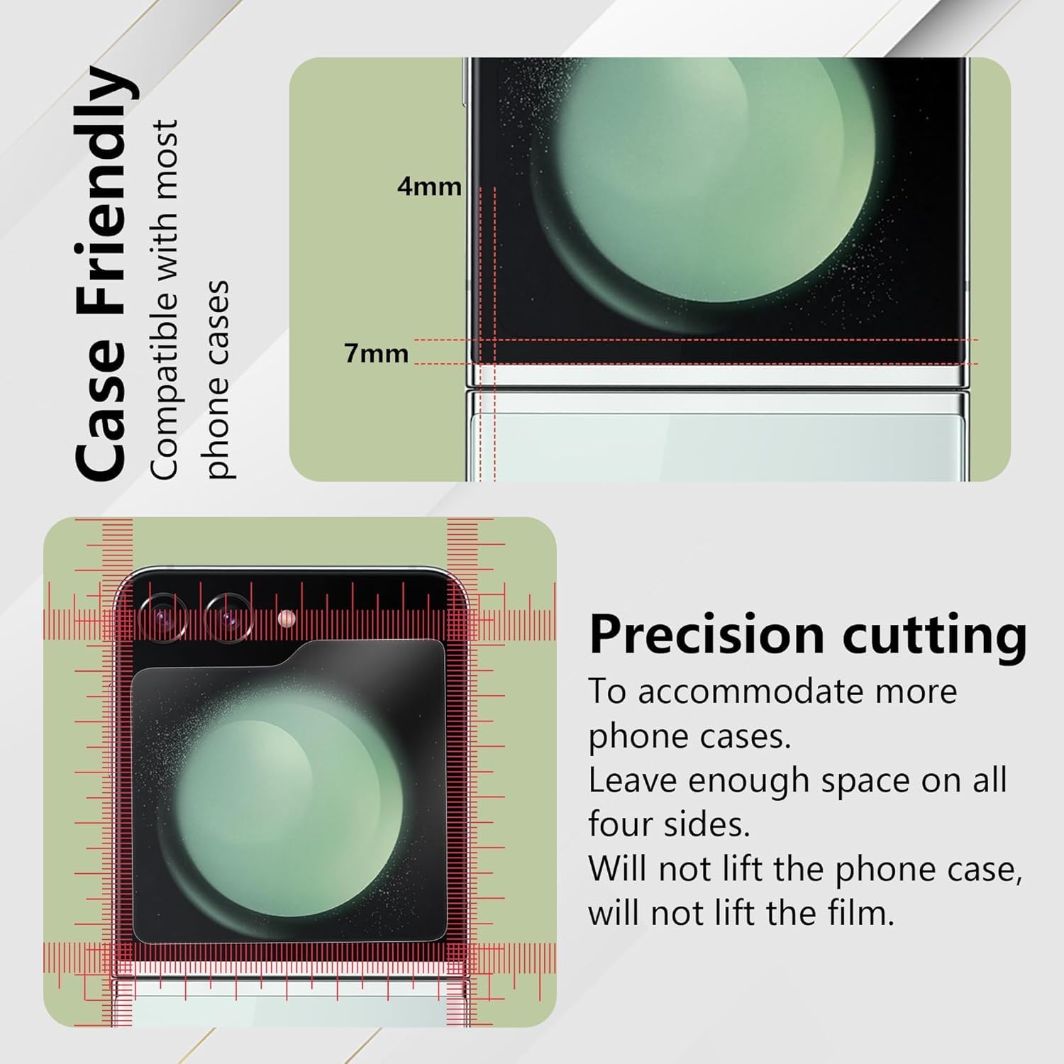 [1:1 Design]: Specifically for the Galaxy Z Flip 5, Using laser cutting technology, This craftsmanship ensures a perfect fit with your phone's screen, preventing dust and scratches from intruding, while still being compatible with cases