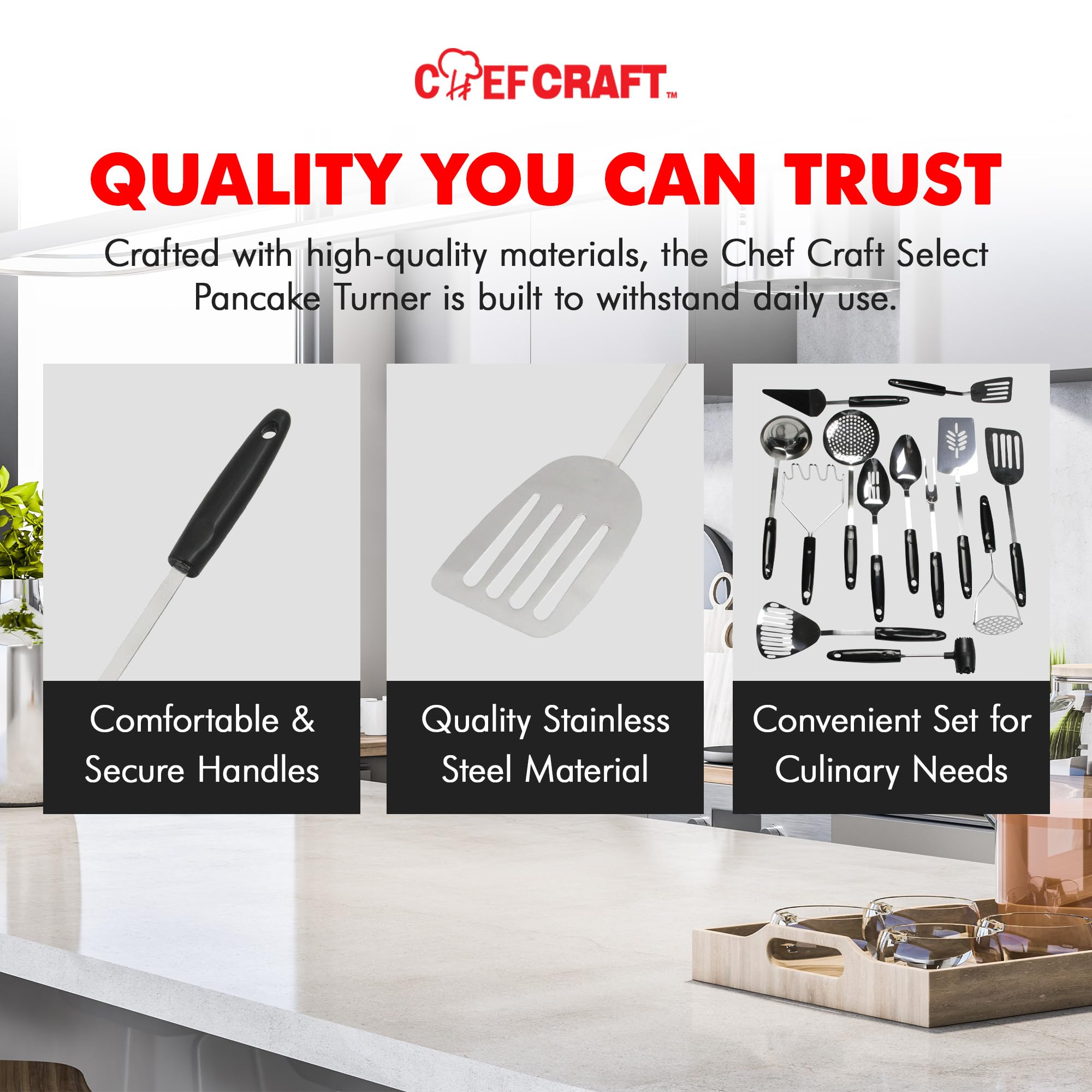An essential in any kitchen, this stainless steel turner offers an ergonomic plastic handle and a stainless steel construction which resists rust. It is perfect to use with stainless steel and cast iron, or any pan that does not have a non-stick coating. Reach for this Select Spatula/Turner every time that you are cooking with Stainless steel and you won't go wrong!