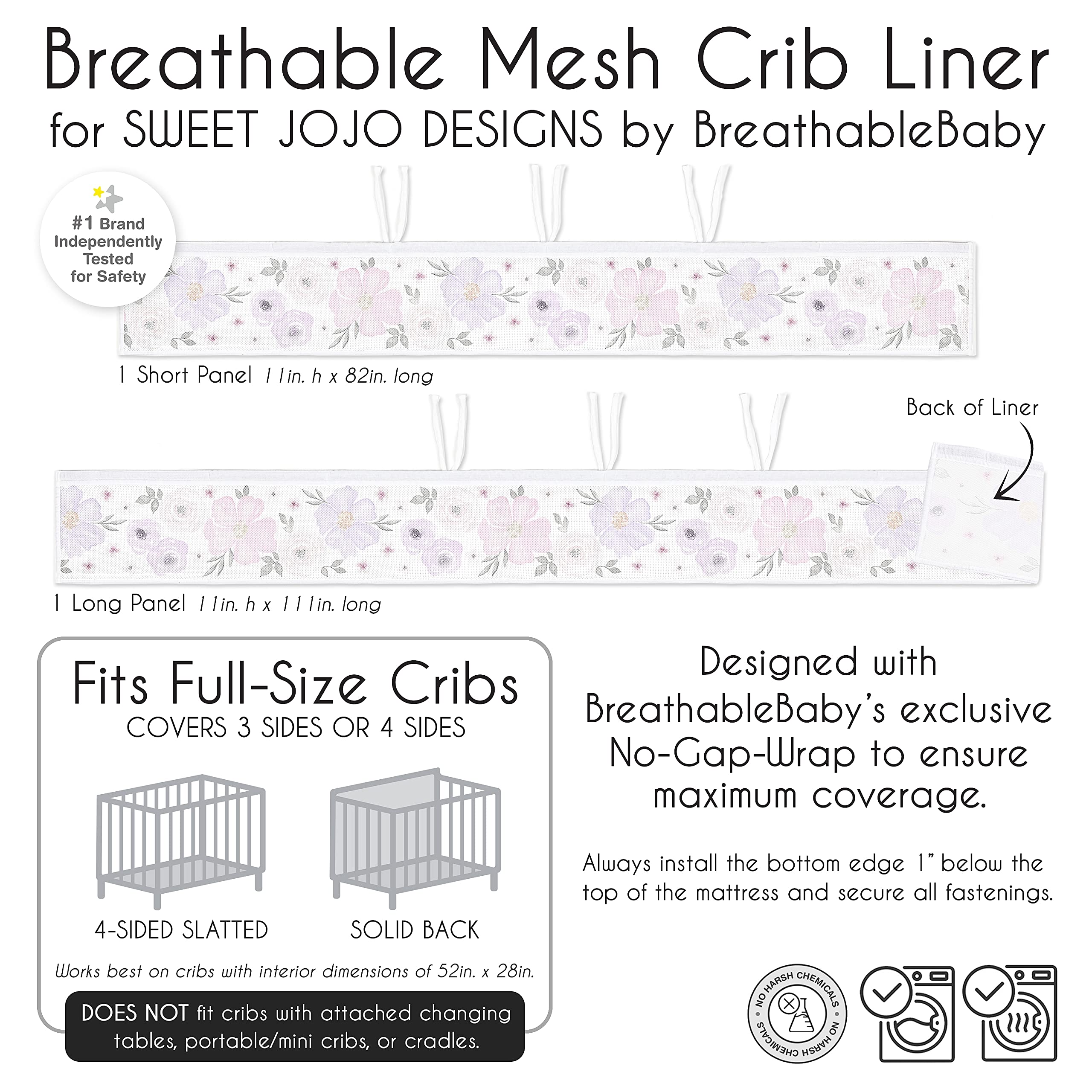Includes: (1) Long Panel Mesh Liner: 11in. x 111in. and (1) Short Panel Mesh Liner: 11in. x 82in. specifically designed for standard crib styles (such as solid back and 4-sided slatted style) sold in North America. DOES NOT FIT and should never be used in cribs with attached changing tables, cradles, toddler beds, bassinets, portable/mini cribs or solid end cribs.
