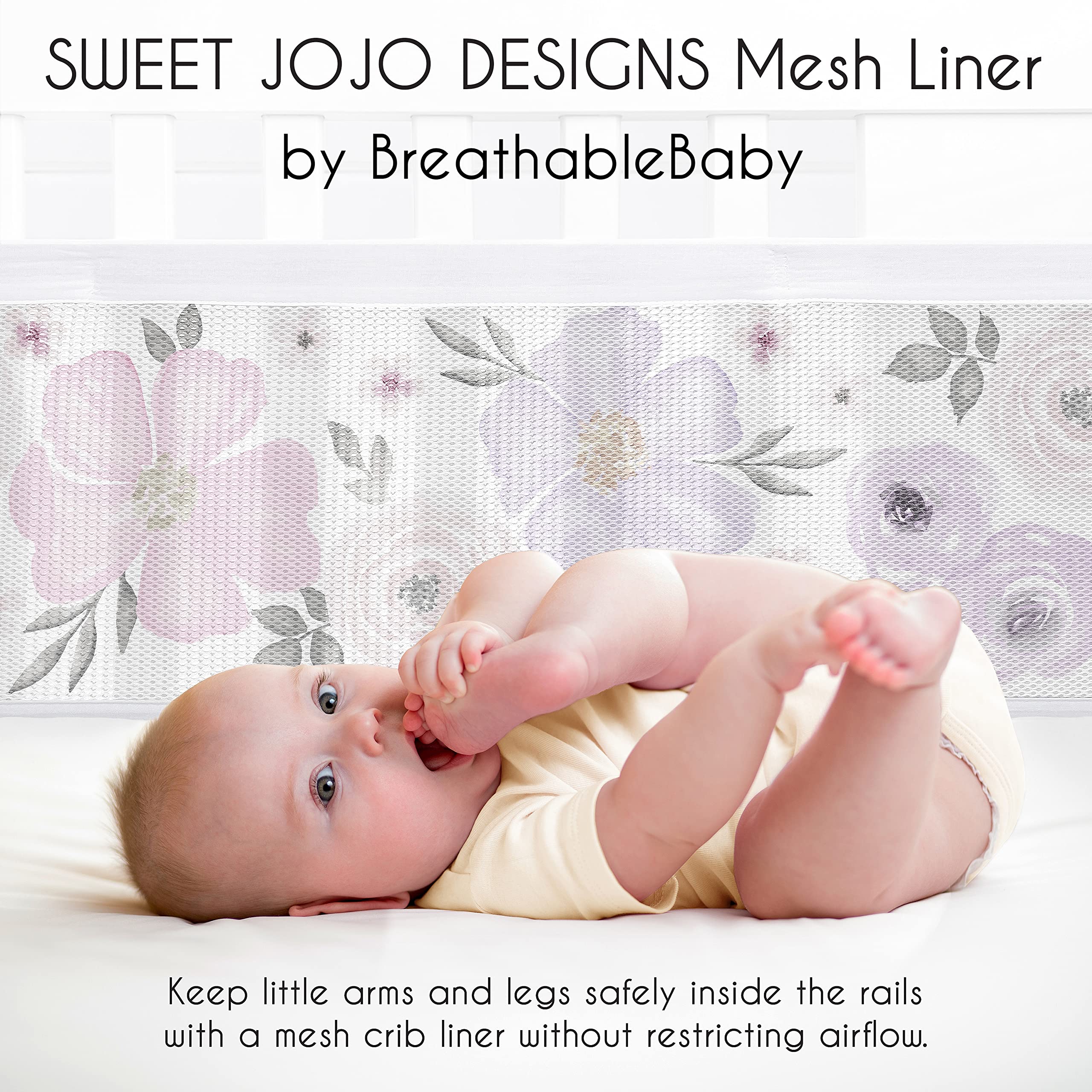 Mesh crib liners are essential for providing the ideal solution to a painful and disruptive problem: helps keep arms and legs safely inside the crib without the risk of restricted airflow. And, as an added bonus, besides perfectly matching your Sweet Jojo Designs baby bedding set, mesh liners also provide a visual shield to help provide a more peaceful night's sleep. Not to mention, they keep pacifiers inside and within reach!