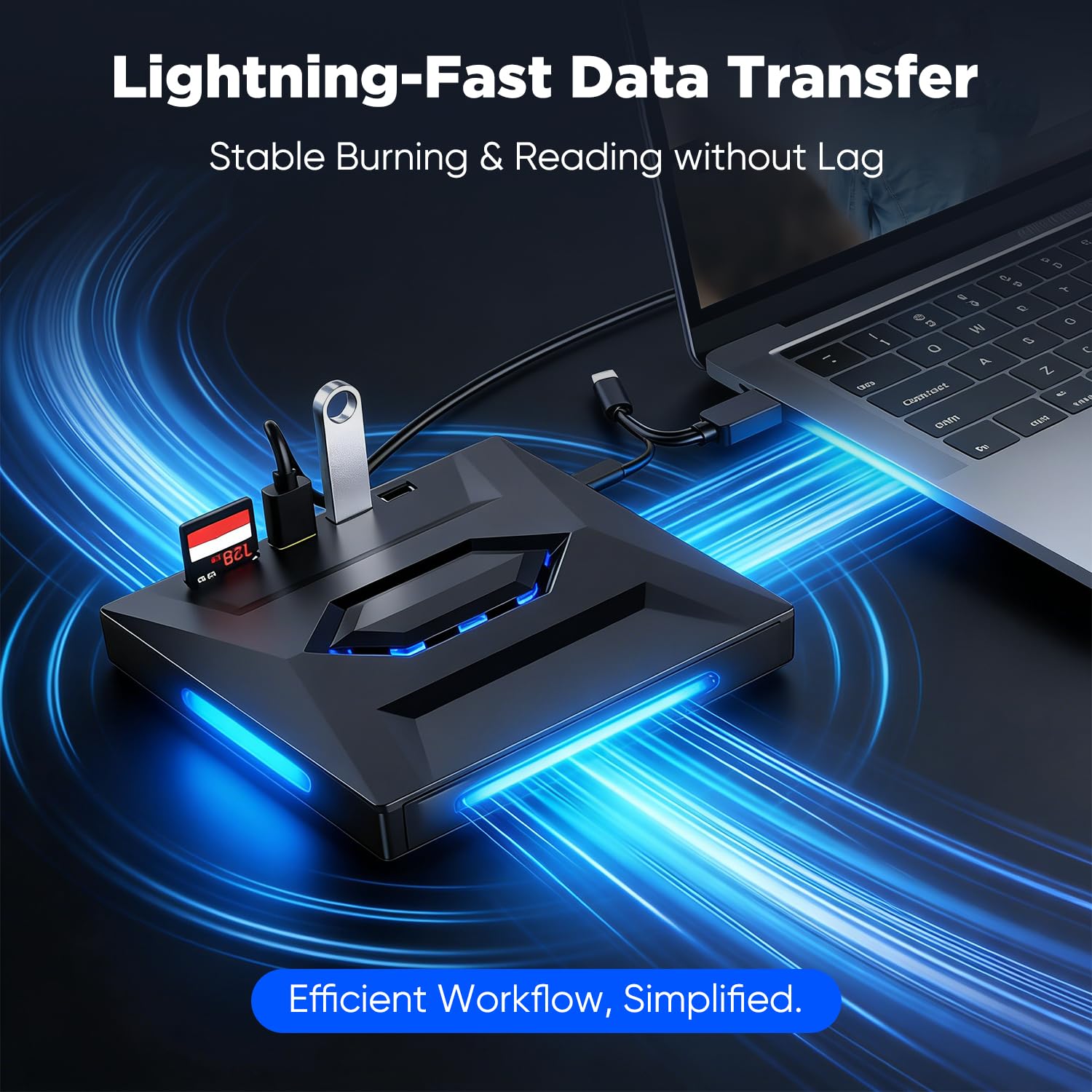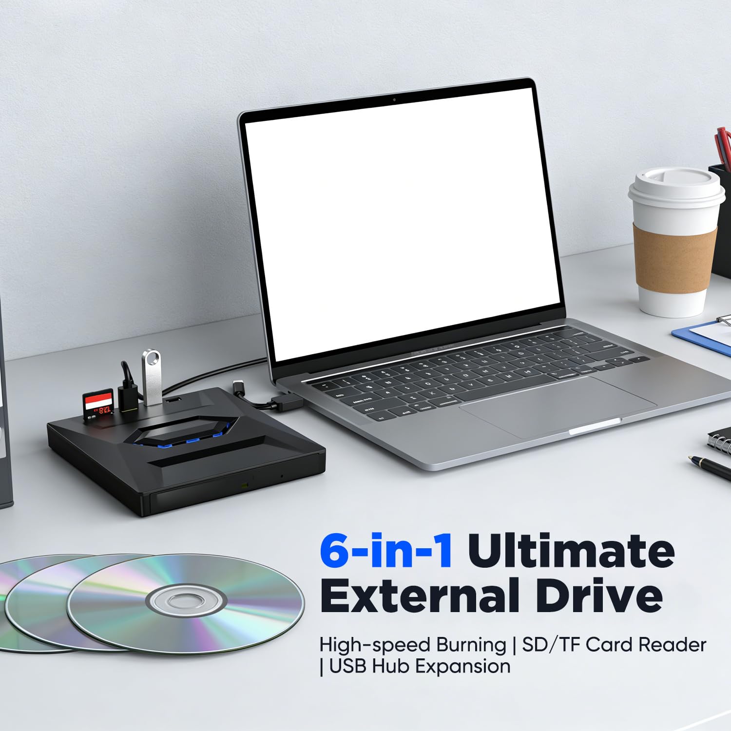 Turn one port into a complete media-and-connectivity setup with the SakerPlus 7-in-1 External USB DVD Drive & Blu-ray Player. It combines an external optical drive with a built-in hub (2×USB-A + 1×USB-C) and SD/TF card reader, so you can play and burn discs while also connecting USB devices or transferring files from memory cards. USB 3.0 supports fast, stable transfers (up to 5Gbps), with read speeds up to 6X for Blu-ray, 8X for DVD, and 24X for CD. For Blu-ray/DVD movie playback, compatible player software may be required depending on your system. The anti-shock structure is designed to help reduce vibration for smoother operation, and the slim form factor makes it easy to carry for home, office, or travel use.