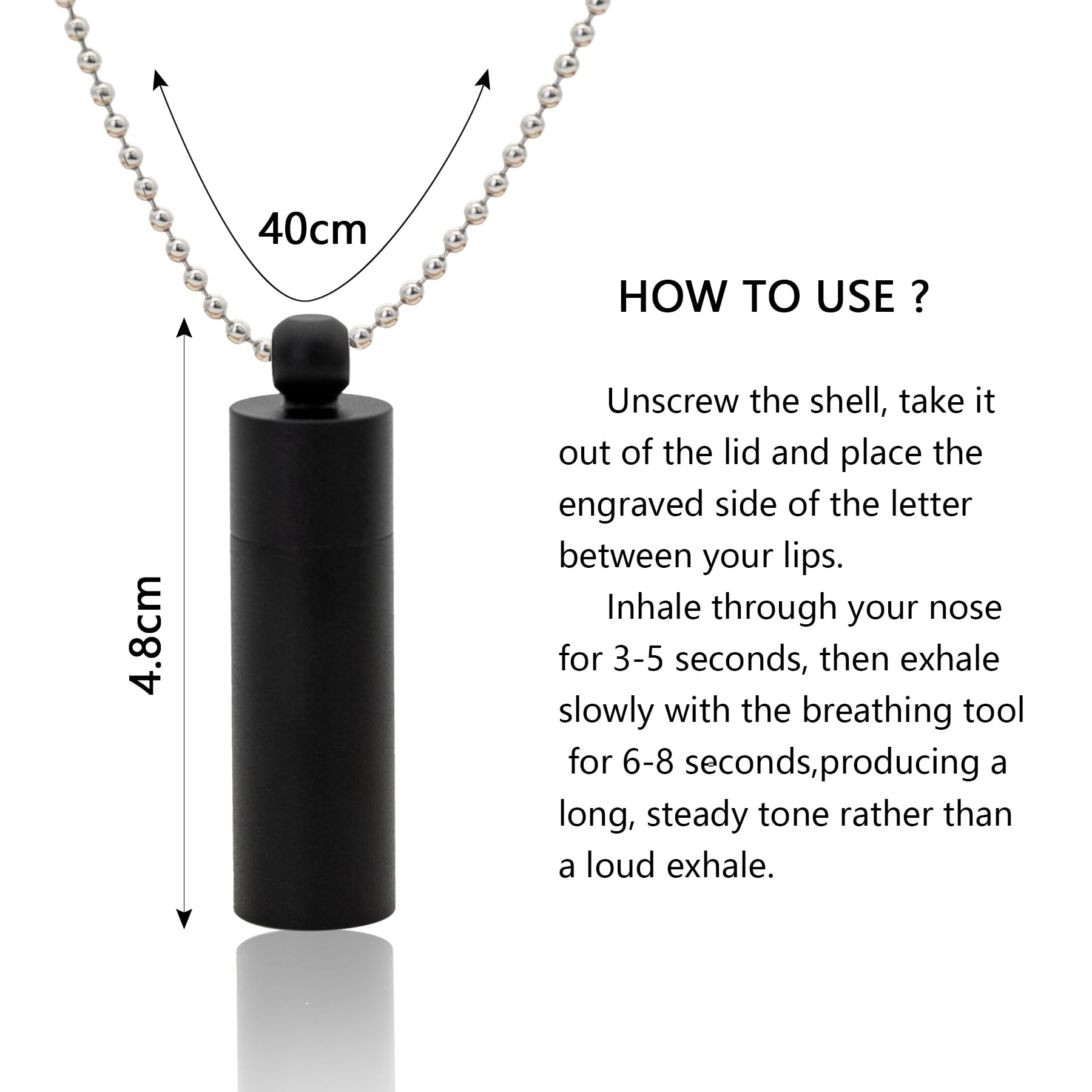 FIND INNER PEACE THROUGH REPETITIVE BREATHING: Our Necklace Works By Naturally Slowing Down Your Breath. inhale through the nose for 3 seconds and hold for 5 seconds, then exhale slowly using the Breathing Tool, blowing a smooth, long tone and having for 6 to 8 seconds. This is one breathing cycle, and we recommend a minimum of 6 breathing cycles to achieve inner peace and release meaningless thoughts and anxieties