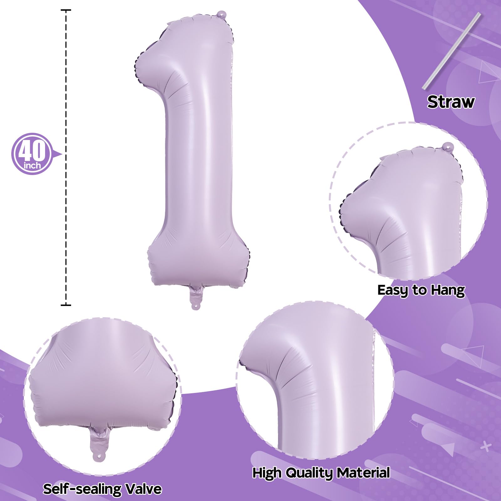 💕 Pastel Purple Number 1 Balloon 💕 - You will get 1pc 40 inch light purple mylar foil number 1 balloon and 1pc straw. Perfect for 1st 10th 12th 13th 15th 16th 17th 18th 21st birthday or anniversary party decorations supplies.