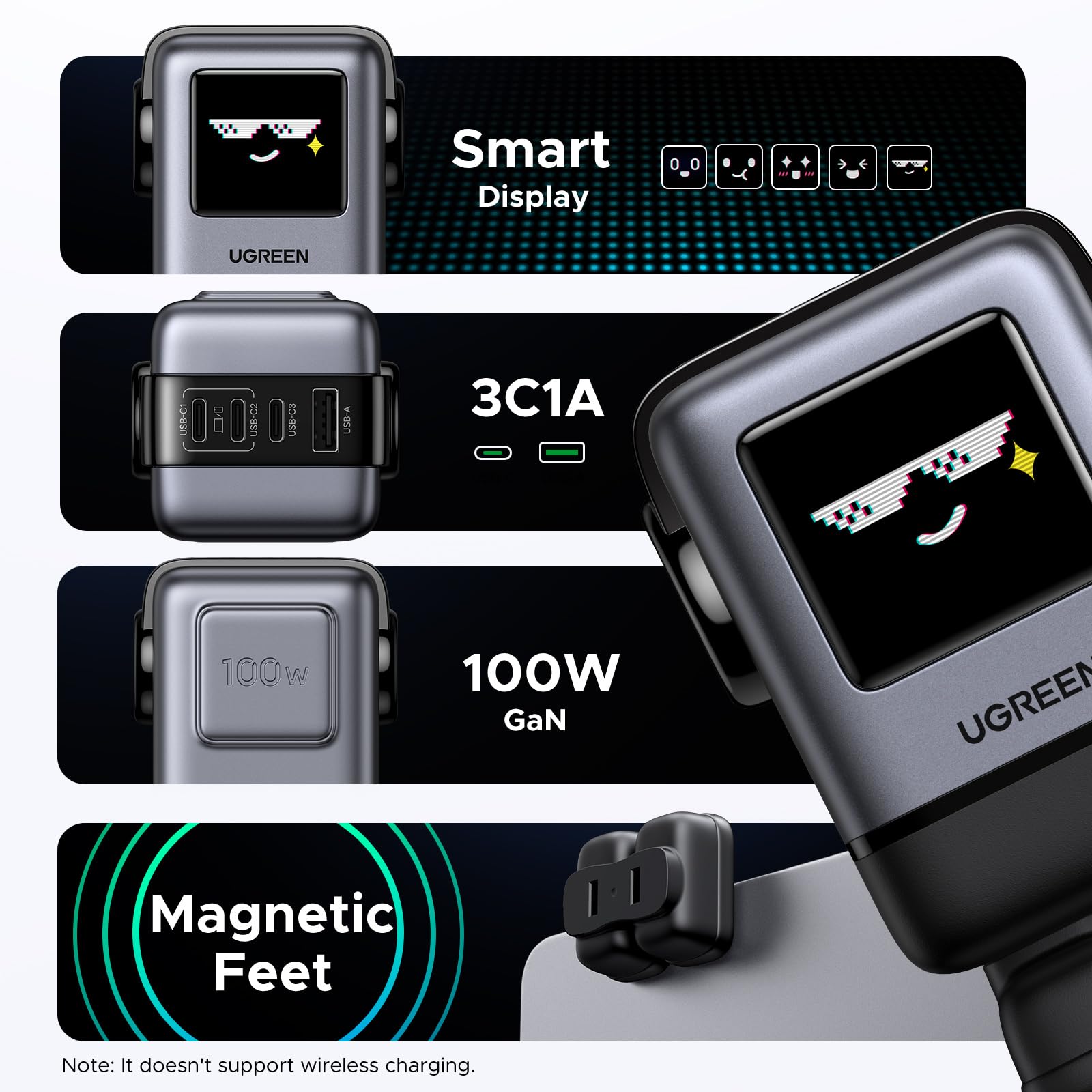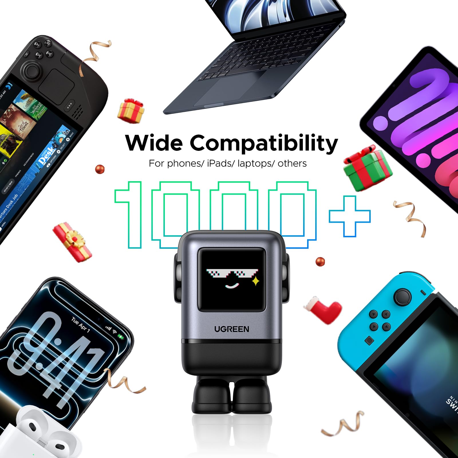 Groovy Robot Design: UGREEN creative series charger, robot shape, TFT screen upgraded from LED, so it shows more interesting expressions according to different charging status. Its feet are magnetic which can be stuck to the laptops without losing it( Note: The expression will only appear when the power is on.)