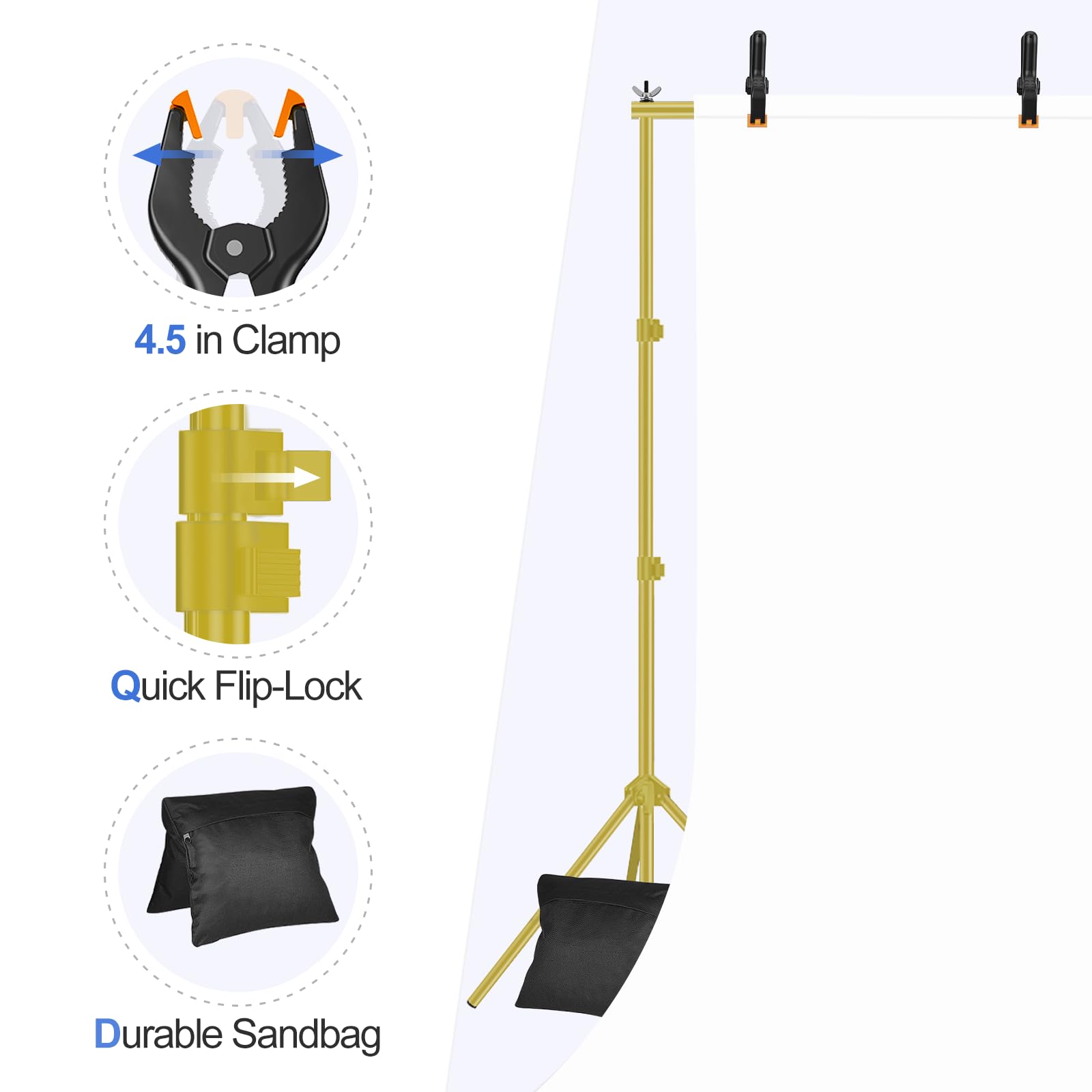 【Better Effect with Accessories】The clamp made of strong and rugged type of plastic, matches with clips enable to clamp anything onto the stand tightly and present a better shooting effect. And sandbags can make the back drop stand more stable after loading heavy objects.