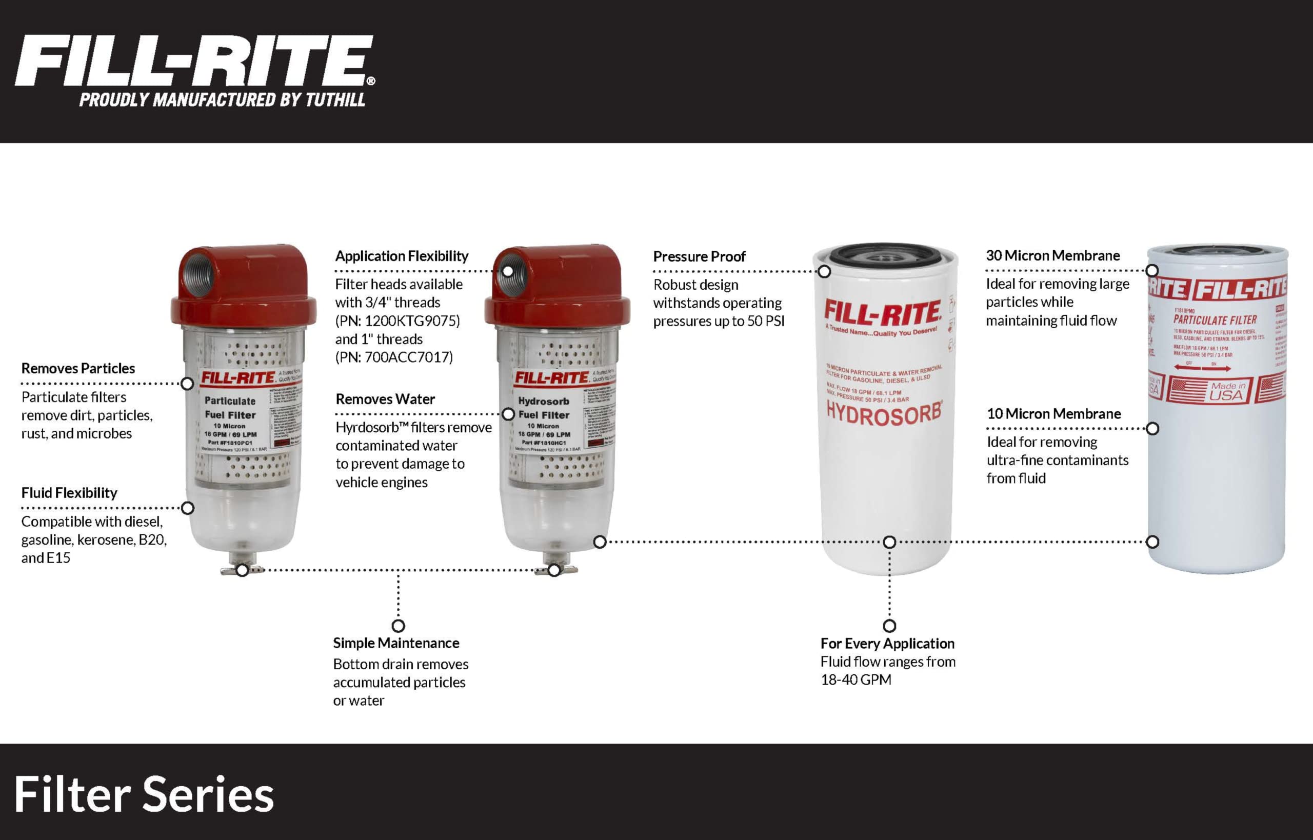 FILL-RITE filters can be used to filter gasoline, diesel or kerosene pumped out of above ground storage and transfer tanks (includes gravity flow applications). Each filter is manufactured with a resin impregnated cellulose media for the removal of dirt, rust or microbes (does not absorb water out of fuel). Model 1200R9146 is a particulate replacement element for F1810PC1 filter.
