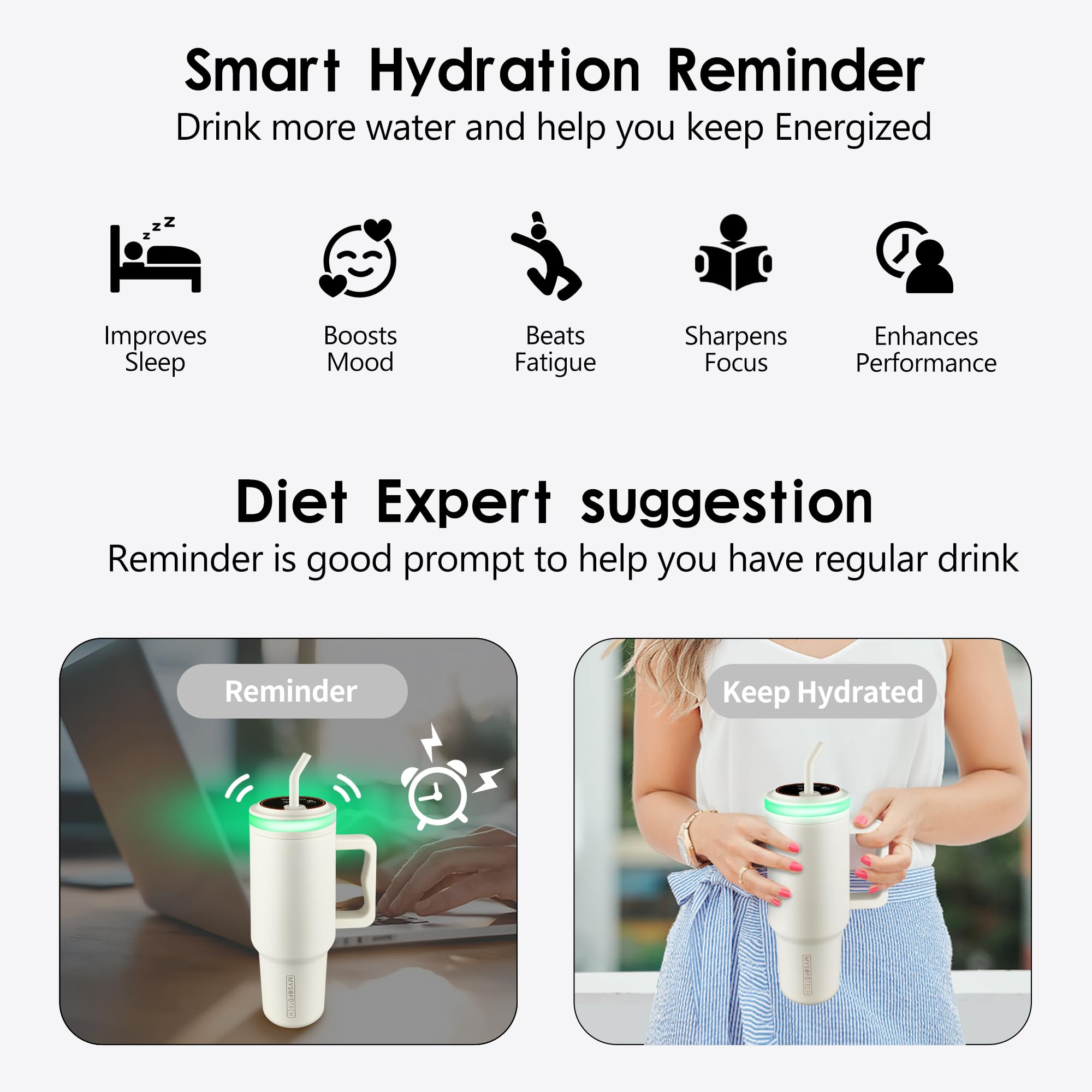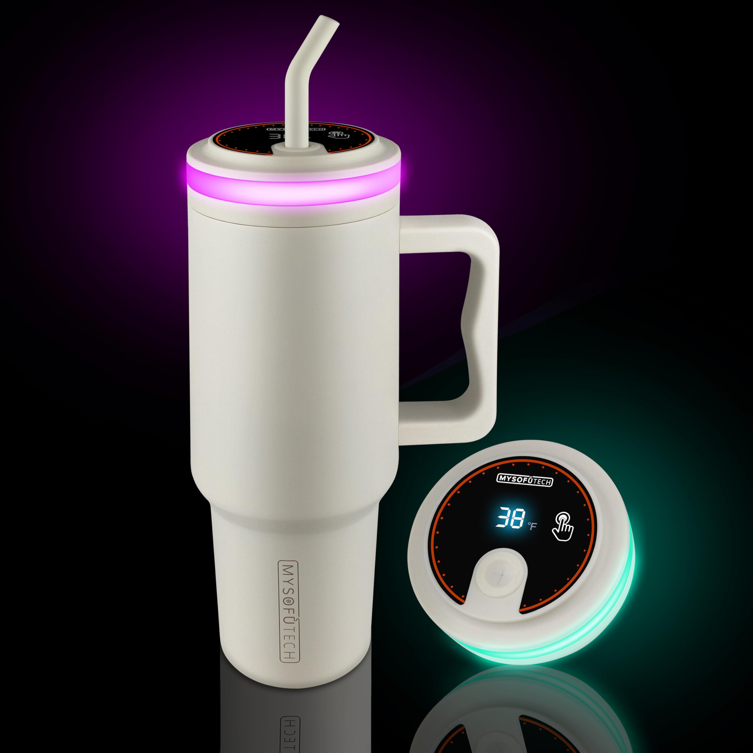 Advanced Tumbler:Hydration reminder, temperature probing and LED mood lighting are integrated as a smart tumbler. Hydration reminders remind you to keep hydrated with green flashing lighting hourly to build healthy habit for you. With temperature sensor and numeric display, never have to guess drink’s temperature any more. For health-conscious and practicality-minded, this smart tumbler with lid and straw is your essential companion.